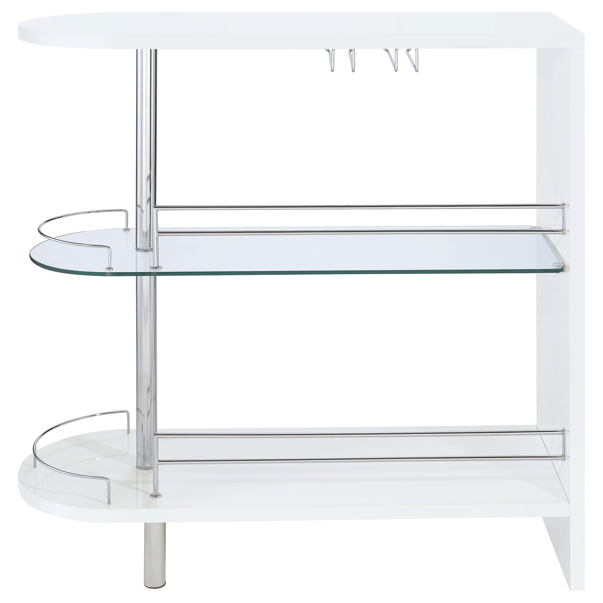 Liven up your next gathering with this attractive, contemporary bar unit. With a sleek design and a smooth, glossy white finish, it has a modern and glamorous look. Two tempered glass shelves provide lots of space for storage, while a built-in stemware rack adds extra convenience. It comes complete with metal guard rails to safely keep bottles and supplies in one place. Crafted from high-quality materials, this sophisticated unit is a stylish and convenient upgrade for your entertaining needs.