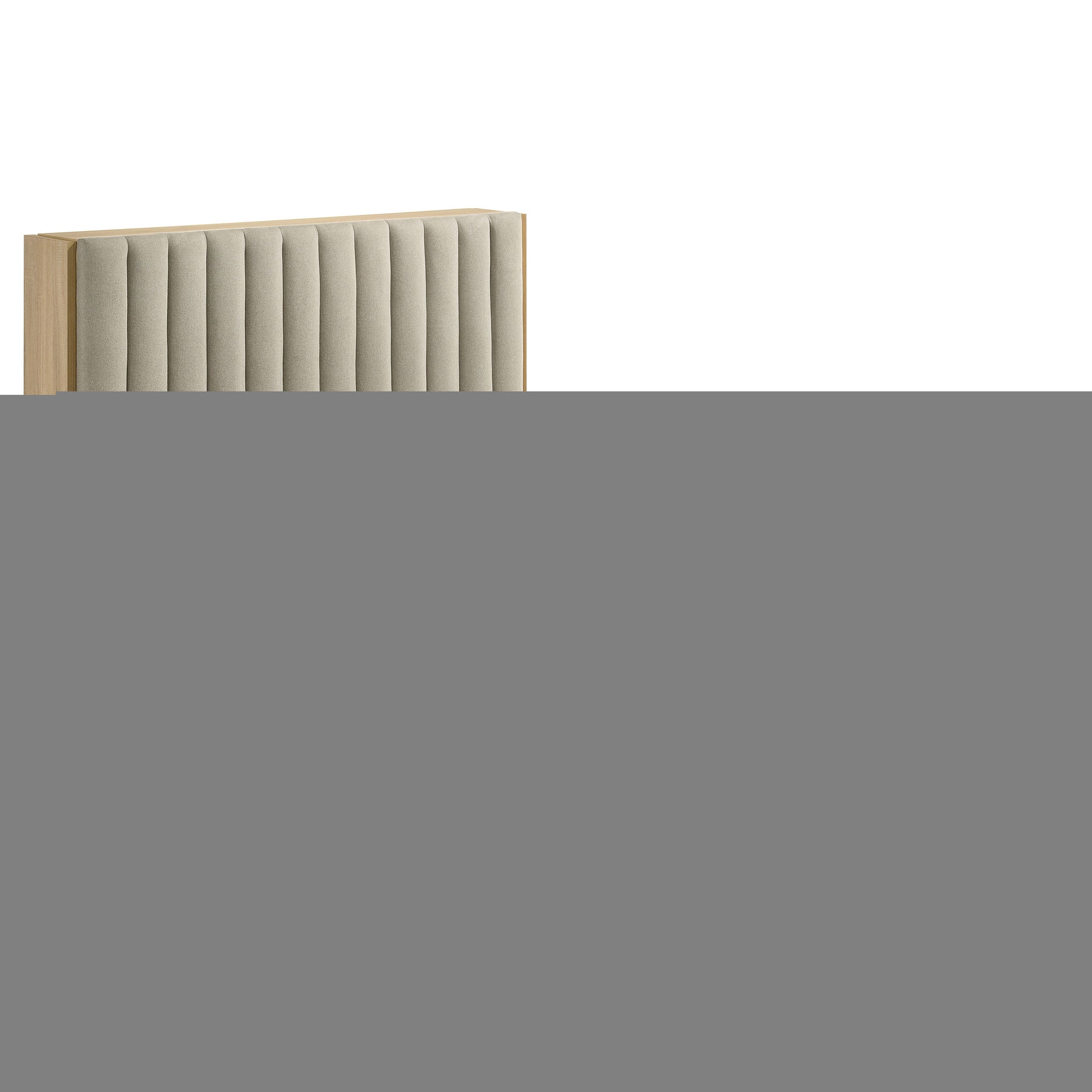 A striking balance of softness and ingenuity, this storage bed is a true centerpiece. A plush, vertical channel-tufted headboard is embraced by light oak bookcase panels, each with three open shelves that glide outward on hidden casters. Wrapped in textured fabric and built with engineered wood and a durable laminate veneer, the supportive platform base offers comfort and stability with a touch of modern grace.