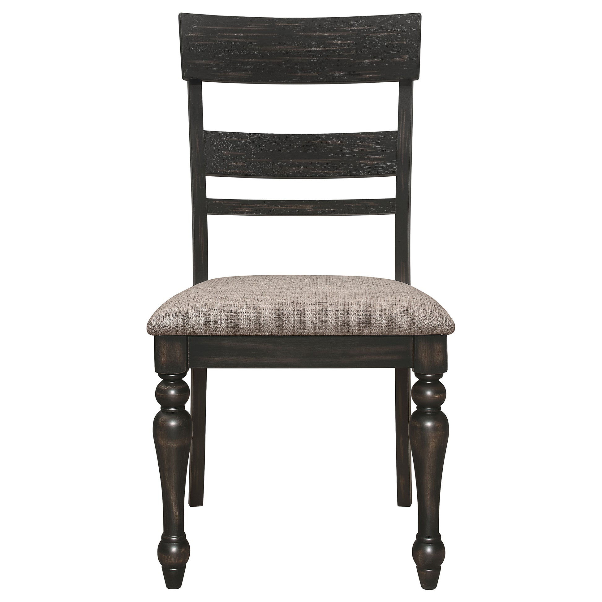 Traditional attitude is bold and rustic with modern updates adding style to your dining area. This six-piece dining set brings out the best in a hybrid aesthetic of farmhouse and mid-century looks with a soft, versatile color and finish palette and construction of rubberwoods and wood products. A rectangular table mixes finishes between its brown brushed finish top and a glam charcoal sand through finish base and legs. Curvy lines and turned legs add an alluring feel to a table playing host to brown finish ladderback chairs and matching bench. A smoothly arched side silhouette with turned front legs creates a glam look, embellished with neutral and soft stone brown fabric seat upholstery.