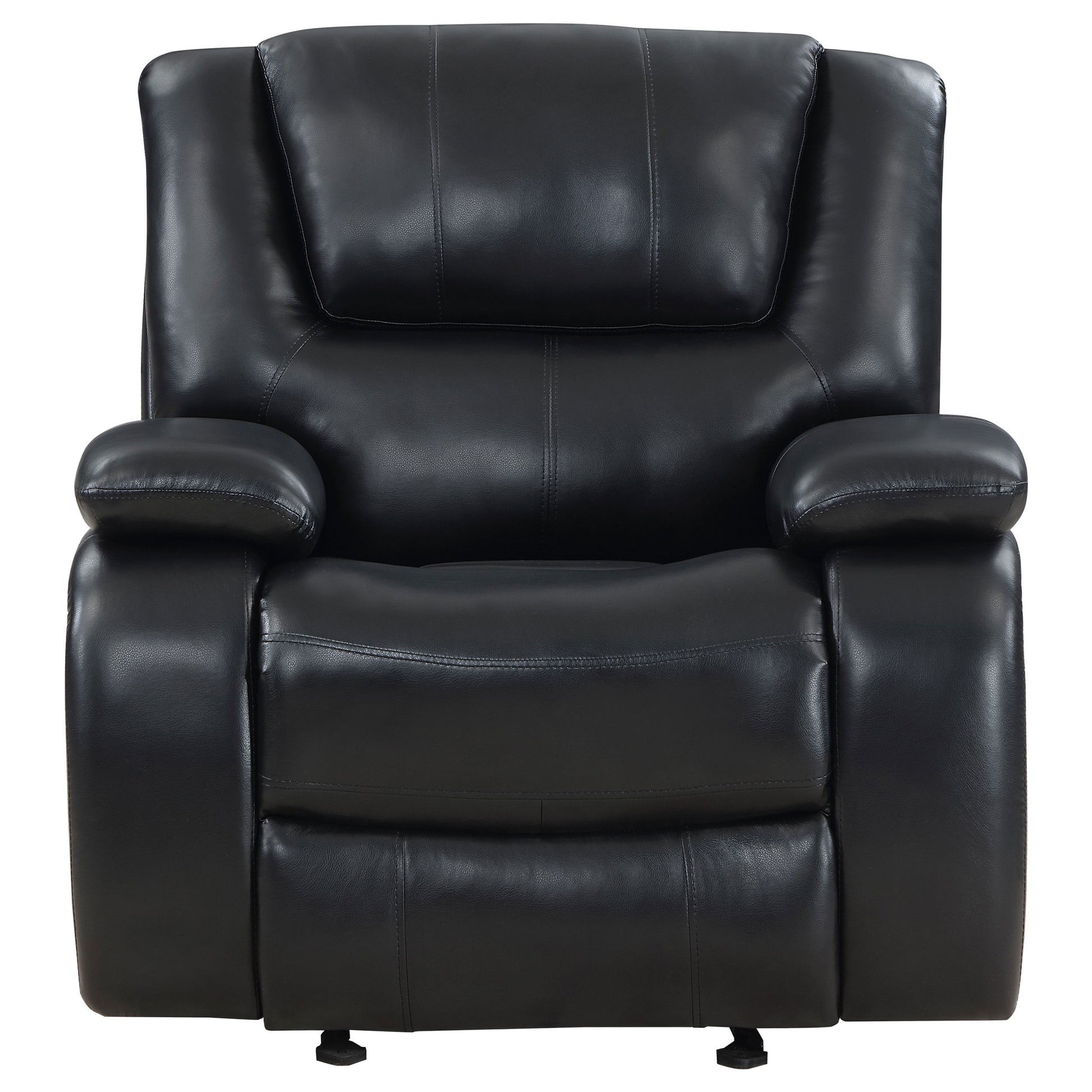 Bold black leatherette upholstery offers the look of luxurious leather with easy-care maintenance as the glider recliner is versatile and beautiful. Living rooms, family rooms, and dens become comfort zones with the plump feel and clean design of a classic glider recliner built for hours of seating comfort as well as entertaining. Manual reclining with the bonus of a gliding motion is easy and pleasant, allowing a variety of positions for sitting and lounging. Choose this elegant recliner with pillowy support, as the attached seat and back cushions feature plump foam filling with channeling to target body comfort and padded armrests over rounded sides. Entertain in style and sheer comfort with a glider recliner that’s also ideal for solo lounging and napping.