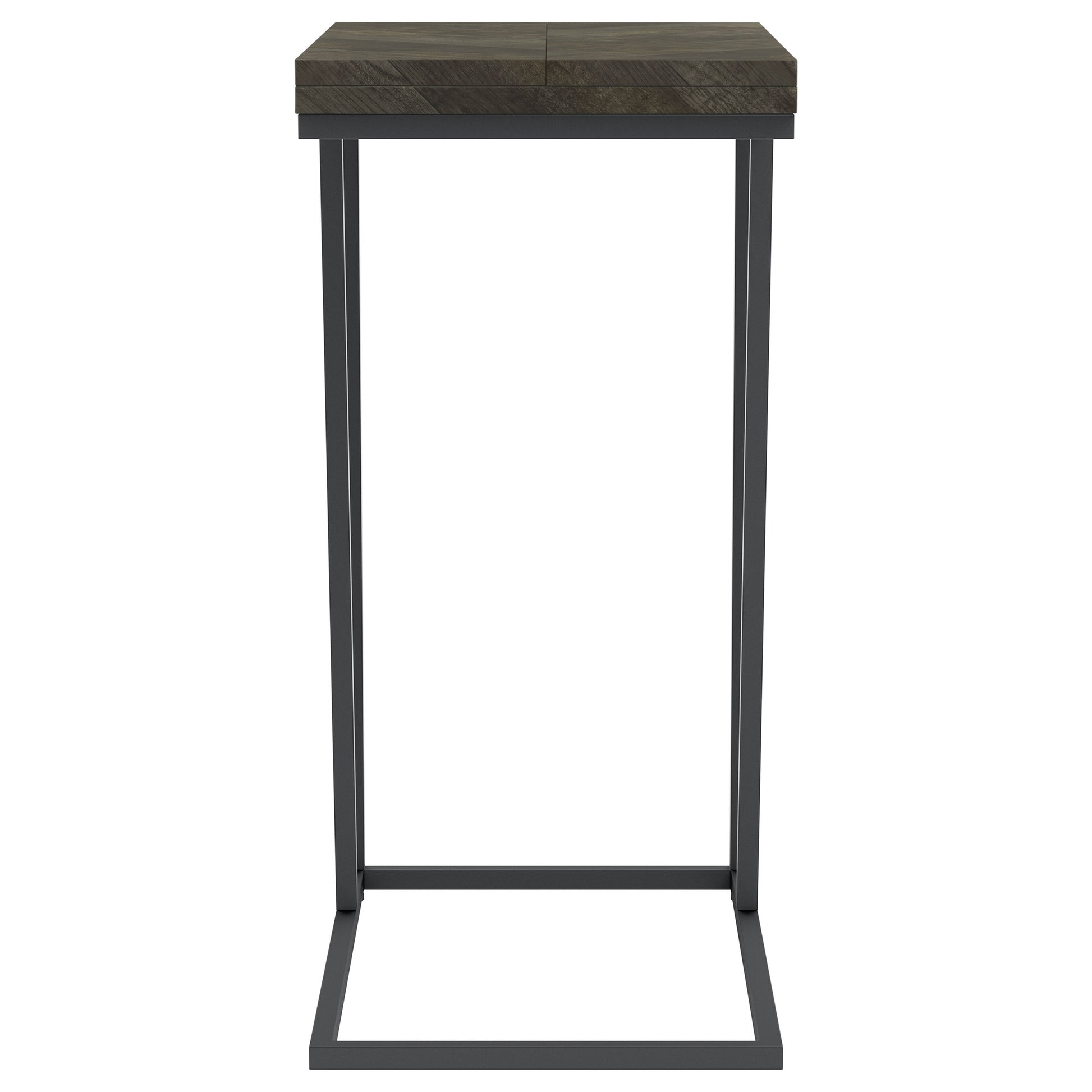 This versatile C-table combines functionality and sleek design, perfect for modern living spaces. Crafted with an engineered wood top featuring a scratch-resistant rustic grey laminate veneer, it offers durability and style. The top folds out, providing expanded surface area when needed. Supported by a sturdy metal base with a sandy black powder coated finish, it blends practicality with elegance. Its slim profile allows it to slide easily under sofas or chairs, making it an ideal space-saving solution.