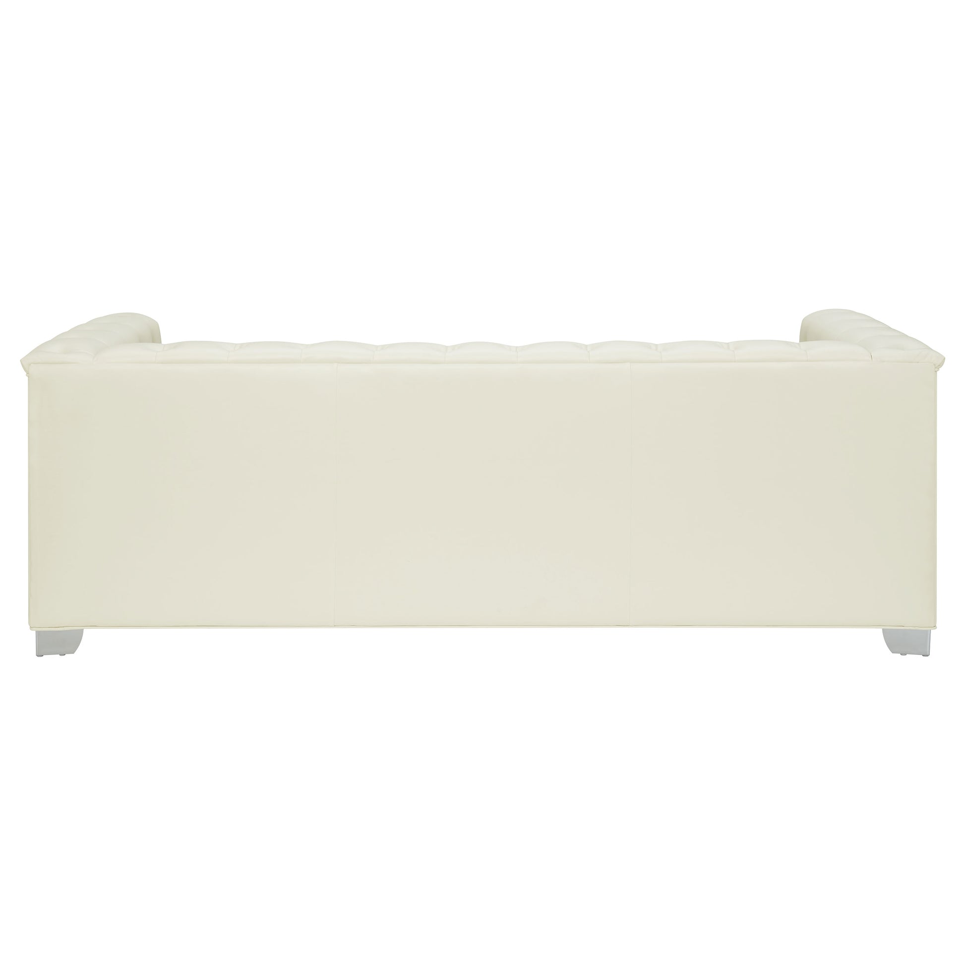 Transform your living room with chic, contemporary style. This stunning sofa is impeccably designed with a smooth, sleek silhouette. Upholstered in padded, breathable, pearl white leatherette, it exudes cool, comfortable glamour. Deep button tufting and chrome doorknocker handles give it a bold, modern edge. High-shine chrome legs pull its look together in stylish harmony.