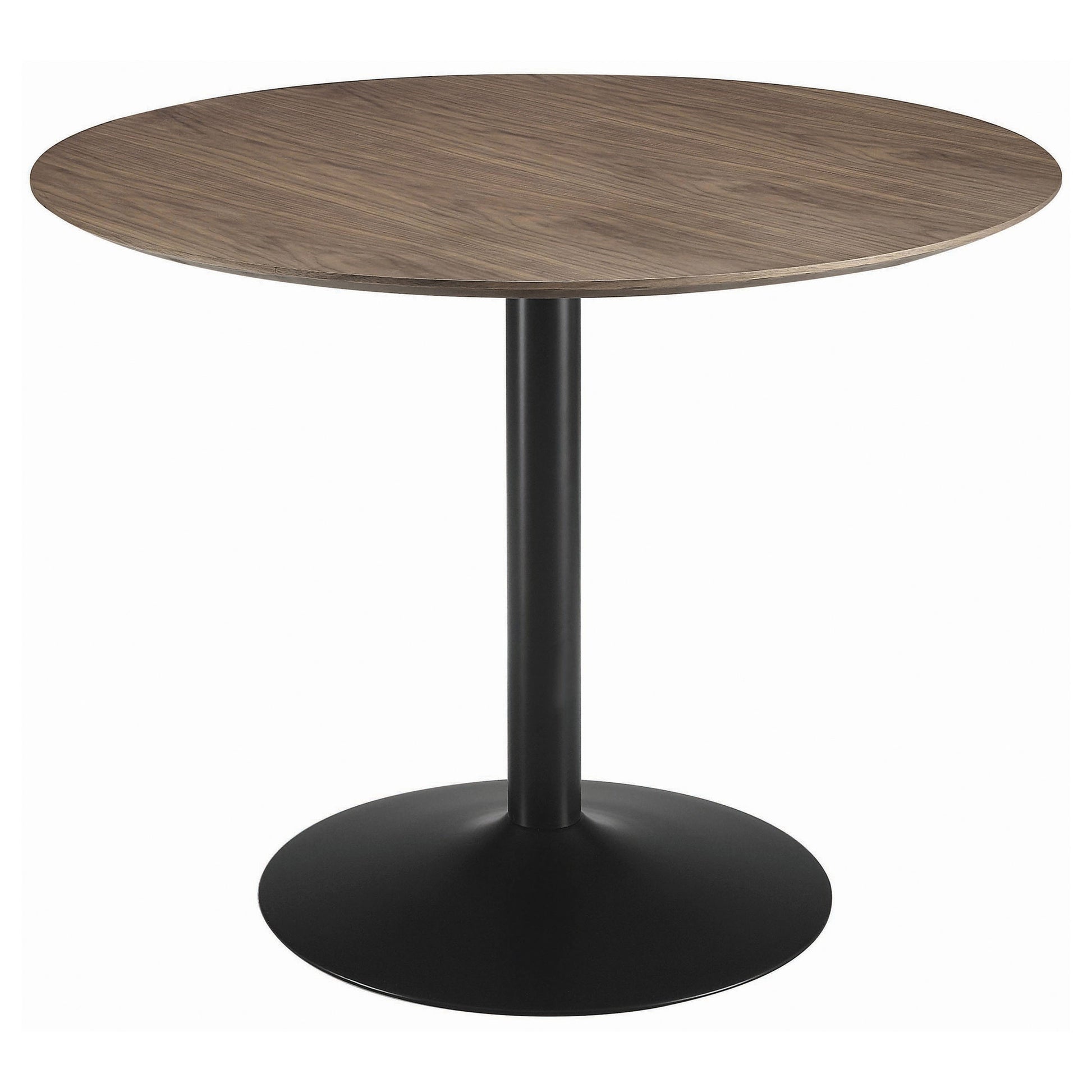 Create a cozy dining spot with this retro-modern round table, featuring a rich walnut veneer top and a smooth black pedestal base. The compact 40-inch size makes it ideal for breakfast nooks or smaller dining areas, while the clean silhouette and warm wood tone offer a touch of mid-century charm. Its sturdy base and inviting finish make it a stylish staple for casual or contemporary interiors.