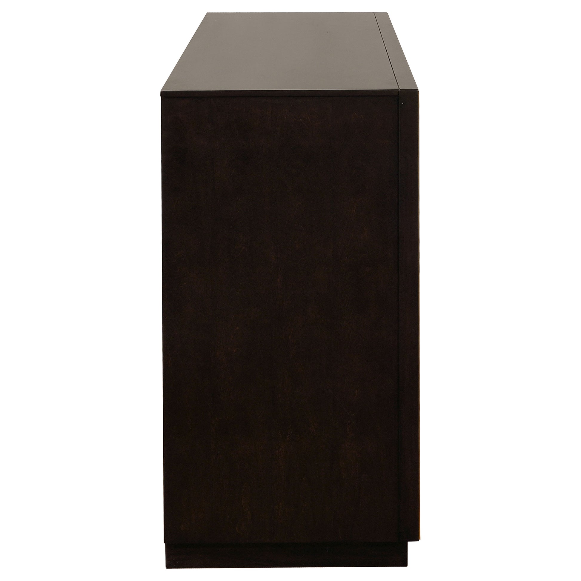 Embrace a retro feel in a modern bedroom with this stunning nine-drawer dresser. Elongated metallic drawer pulls protrude from flat drawer fronts, inspiring a sleek look. In a rich and warm smoke peppercorn finish, the deep hues and interesting silhouette create a bold visual. Its simple and smooth profile creates a structured aesthetic, complete with a smooth base that reaches toward the floor. Enhance with a chic perfume collection or a delightful sculptural piece.