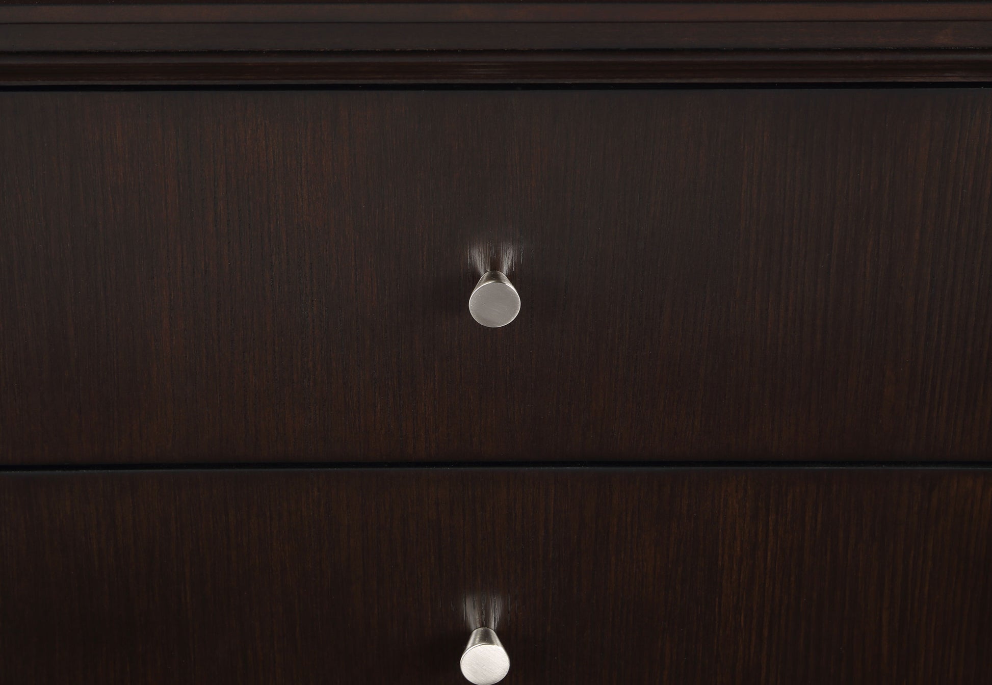 Bring stylish flair and plentiful storage to your bedroom with a modern six-drawer dresser and mirror. It showcases a dark brown wood finish, paired with silver-toned round knobs and ferrules on its legs that add gleaming contrast and depth. Six drawers provide ample storage and organization for clothing and accessories, with a red-brown velvet lined jewelry tray included that's ideal for protecting pieces you wear regularly. The mirror on top of the dresser creates a vanity like space, and is framed for a finished look and feel. This stylish dresser is the perfect addition to your existing bedroom ensemble.