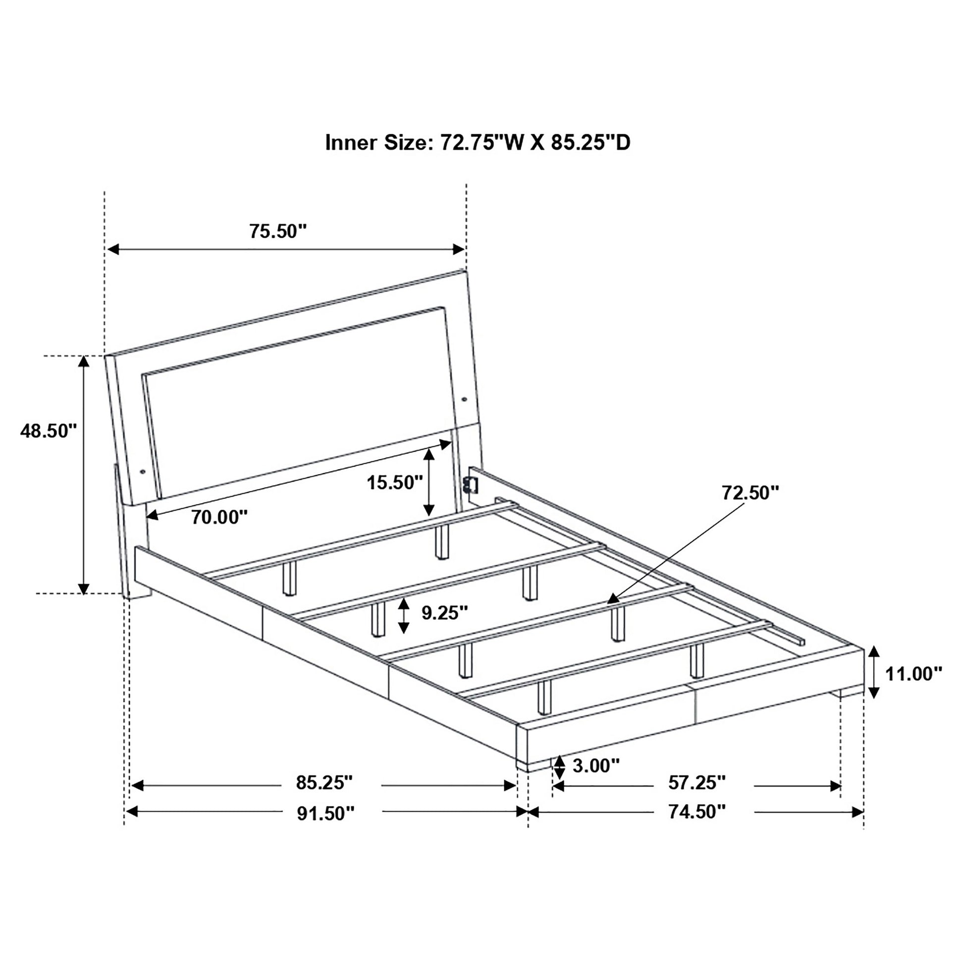 Modern design meets ambient lighting in this contemporary bedroom set. The bed features a white high gloss headboard with built-in blue LED lighting, activated by a convenient touch switch. A faux leather upholstered bed frame adds a refined touch, while matching storage elements offer smooth metal glides and chrome-finished details. With clean lines and integrated lighting, this set adds both functionality and visual impact to any modern bedroom.
