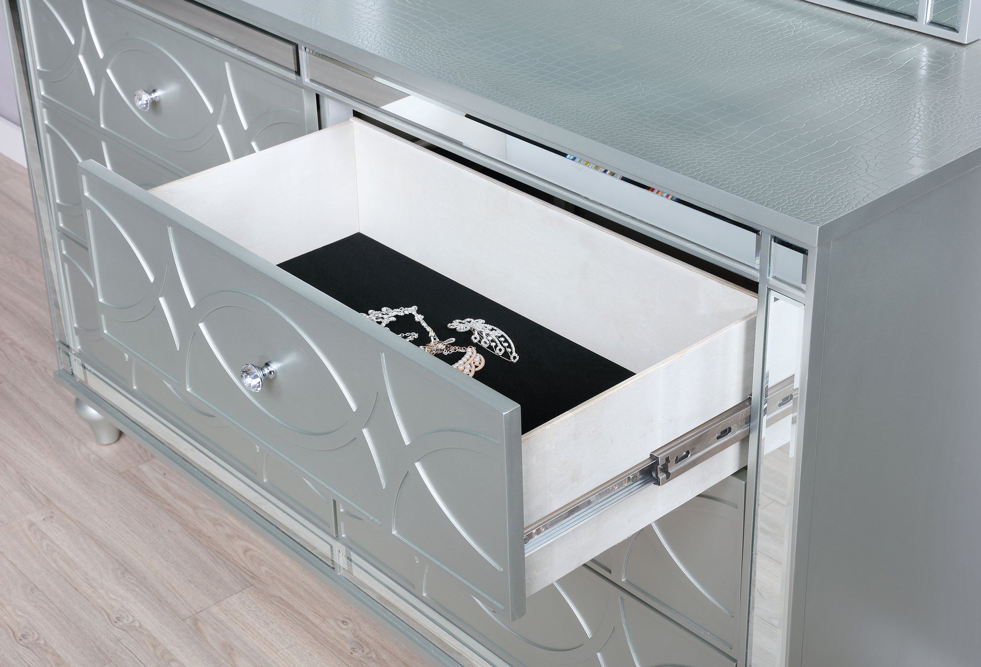 This contemporary 4-piece bedroom set featuring a bed, nightstand, dresser, and mirror imparts a glamorous look and feel to any modern home. Each piece of this exclusive Coaster design comes in a shimmering silver metallic finish that enlivens any space. The imposing bed headboard is upholstered with metallic leatherette that's fully tufted with crystal buttons. The headboard and mirror include white LED touch lighting for a vibrant ambiance, while the nightstand features USB ports. The drawers on each case good are crafted with fret work detail on the front panels and crystal-like pulls, with top drawers lined with black felt to protect your valuables.