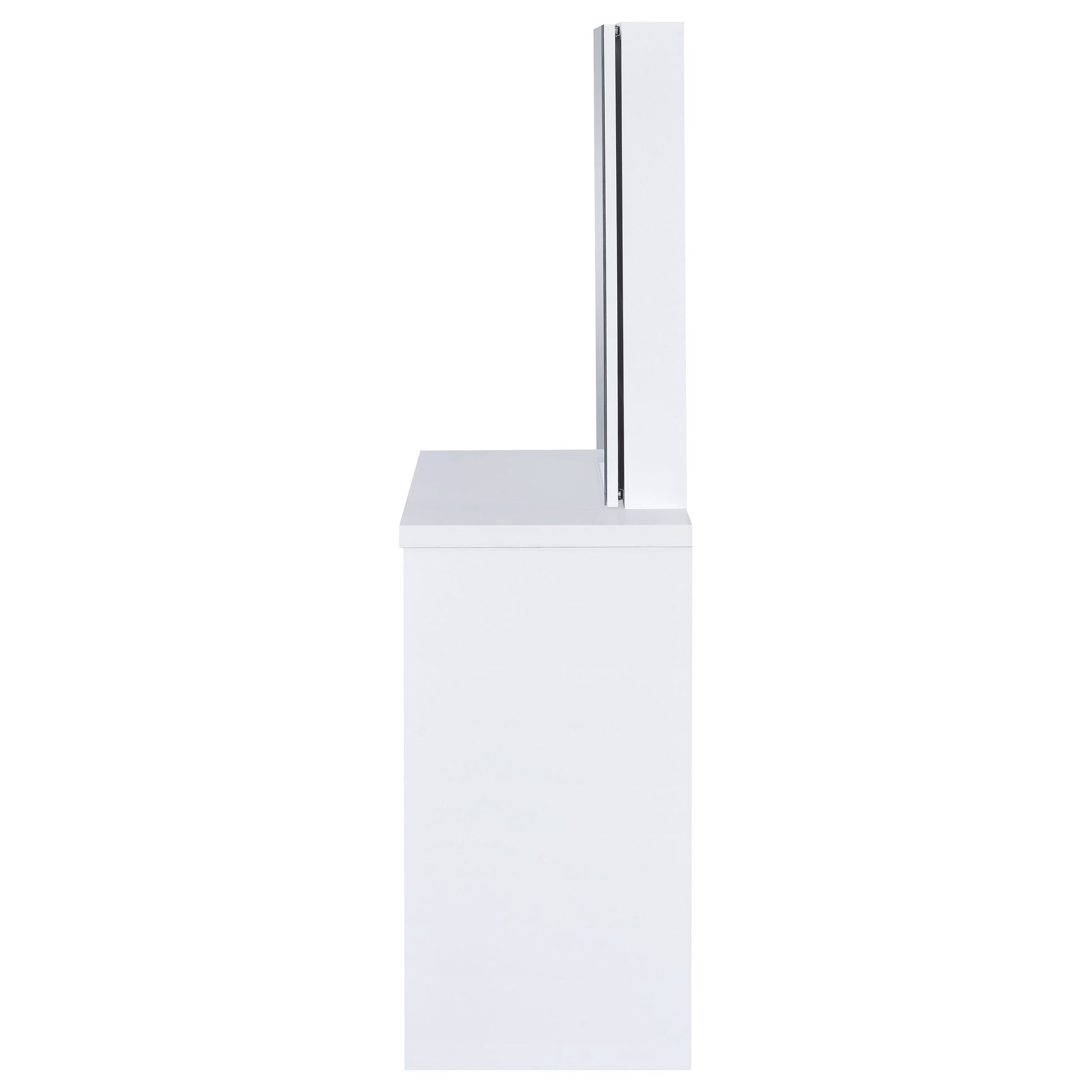 Contemporary white vanity looks great in a modern-style bedroom or dressing room and comes designed to hold your secrets better than a BFF. Pull-out drawer is spacious and compartmentalized for organization to get ready in a hurry (on those rare occasions). The large mirror slides open to reveal concealed jewelry storage compartments. Upholstered stool opens to reveal yet another storage area. This vanity truly is a woman's best friend.