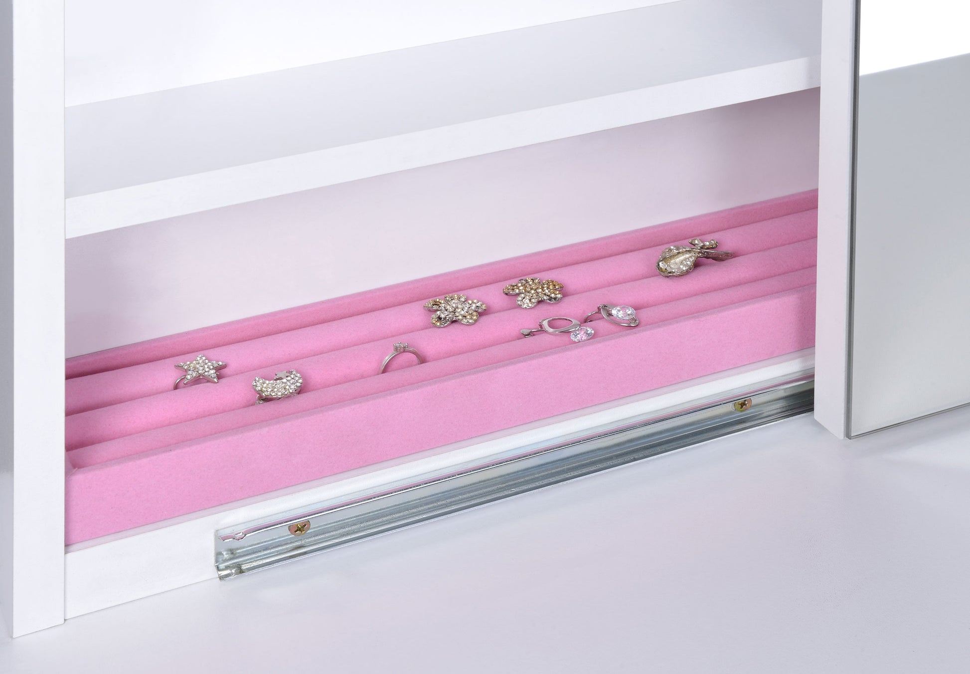 • Slide-to-open mirror features jewelry hooks, two shelves, and ring storage