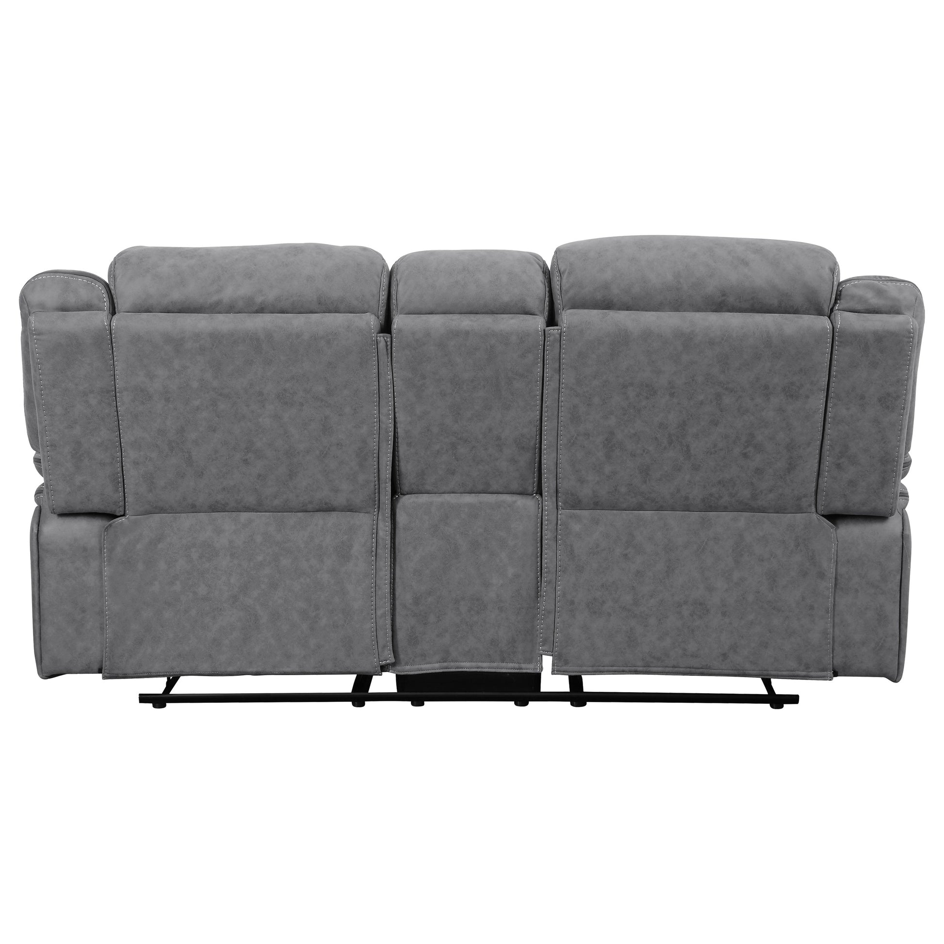 • Reclining loveseat upholstered in grey performance faux suede with stylish stitching