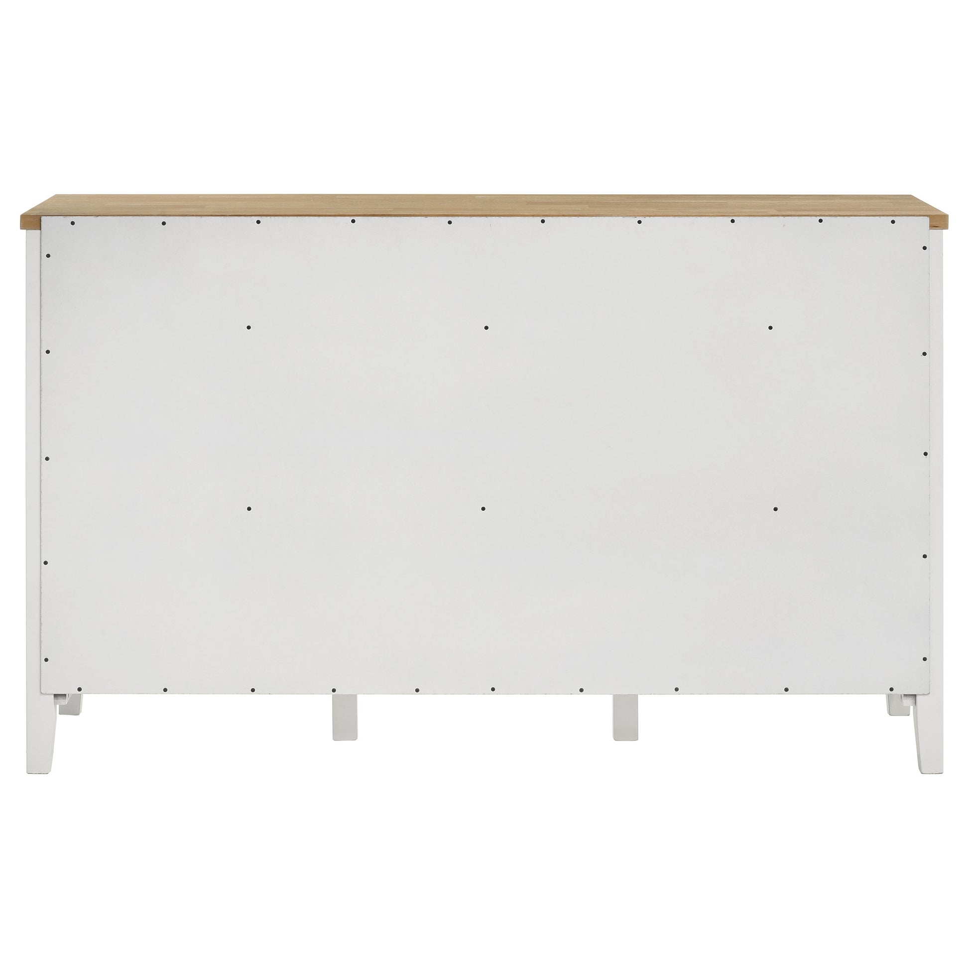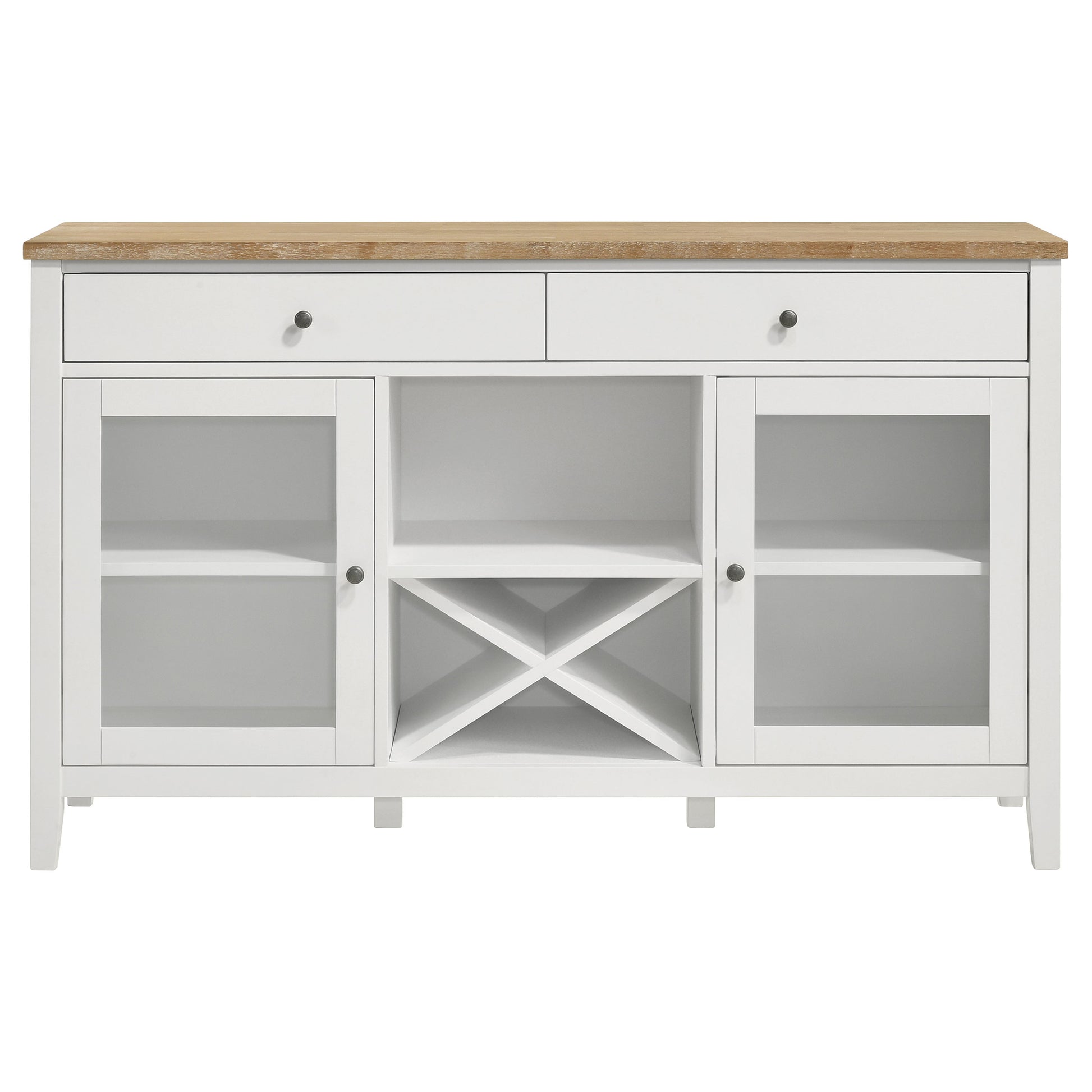 Wire brushing adds the perfect hint of rustic distressing to the table top featured on a modern farmhouse sideboard. Its two-tone look adds charm in a kitchen or dining room, with a natural wood top and crisp white base that adds contrast while maintaining a neutral color palette. Two drawers are ideal for utensils and delicate items with felt lining in a light brown hue. Two side cabinets add glass doors for showing off cookbooks, crockery or glassware. In the center, one open shelf and an X-cross bottle rack add a perfect spot for favorite bottles of wine and stylish decor that brings a personal touch.