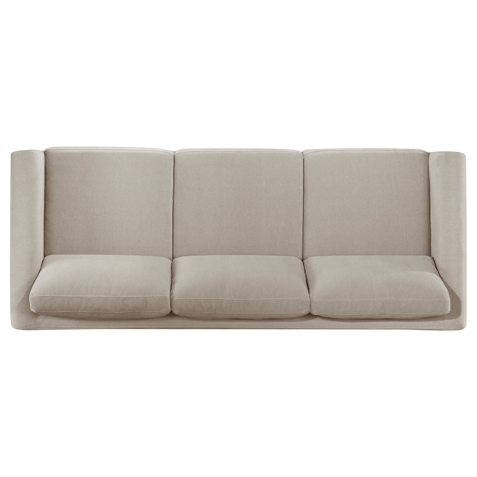 Rooted in clean architectural lines, this upholstered sofa set blends modern structure with plush comfort. Each piece is framed in engineered wood with a warm coffee finish and features recessed panel arms that lend sculptural definition. Upholstered in soft taupe polyester, the seat and back cushions are fully reversible, offering extended usability and lasting support. Designed to bring balanced form and function to contemporary living spaces.