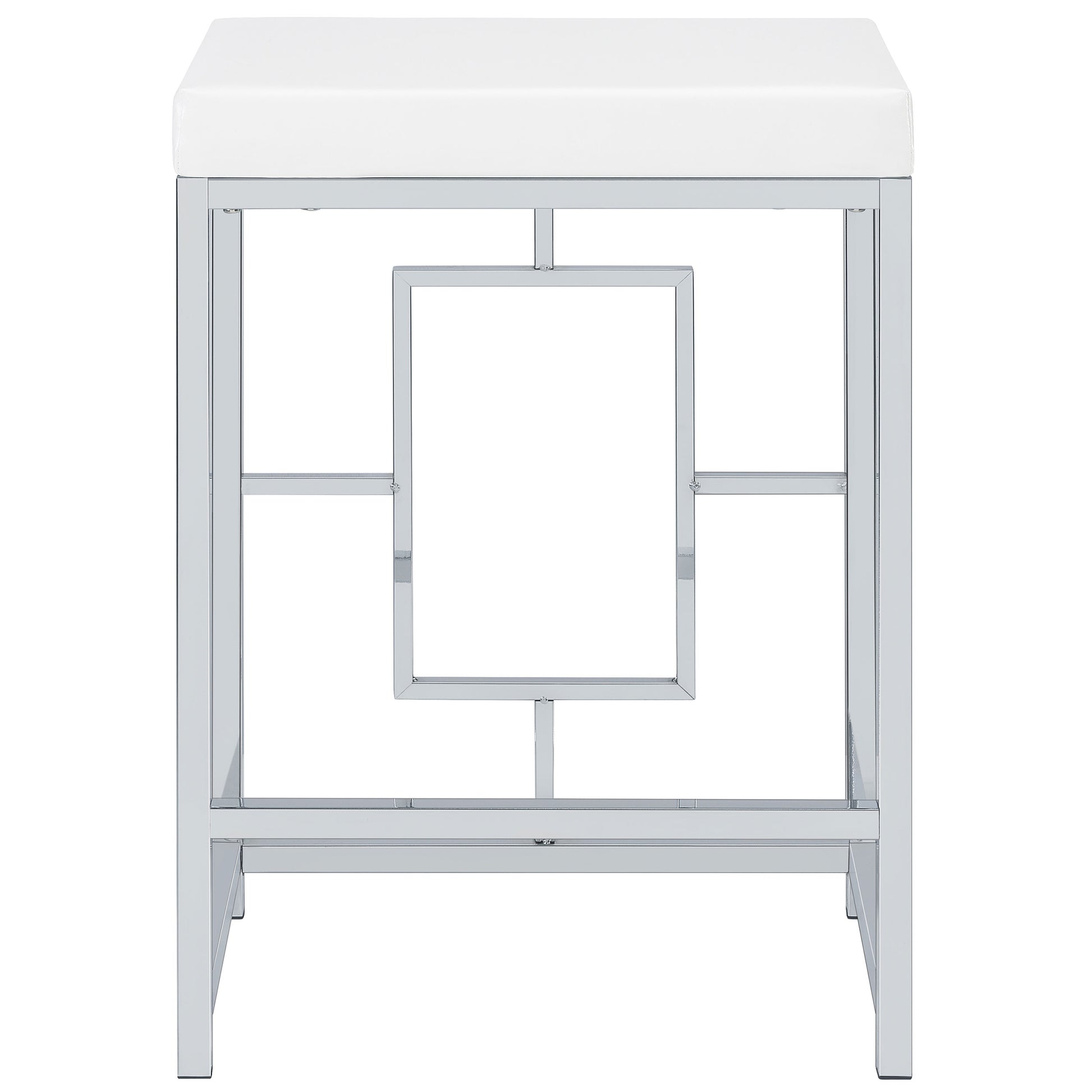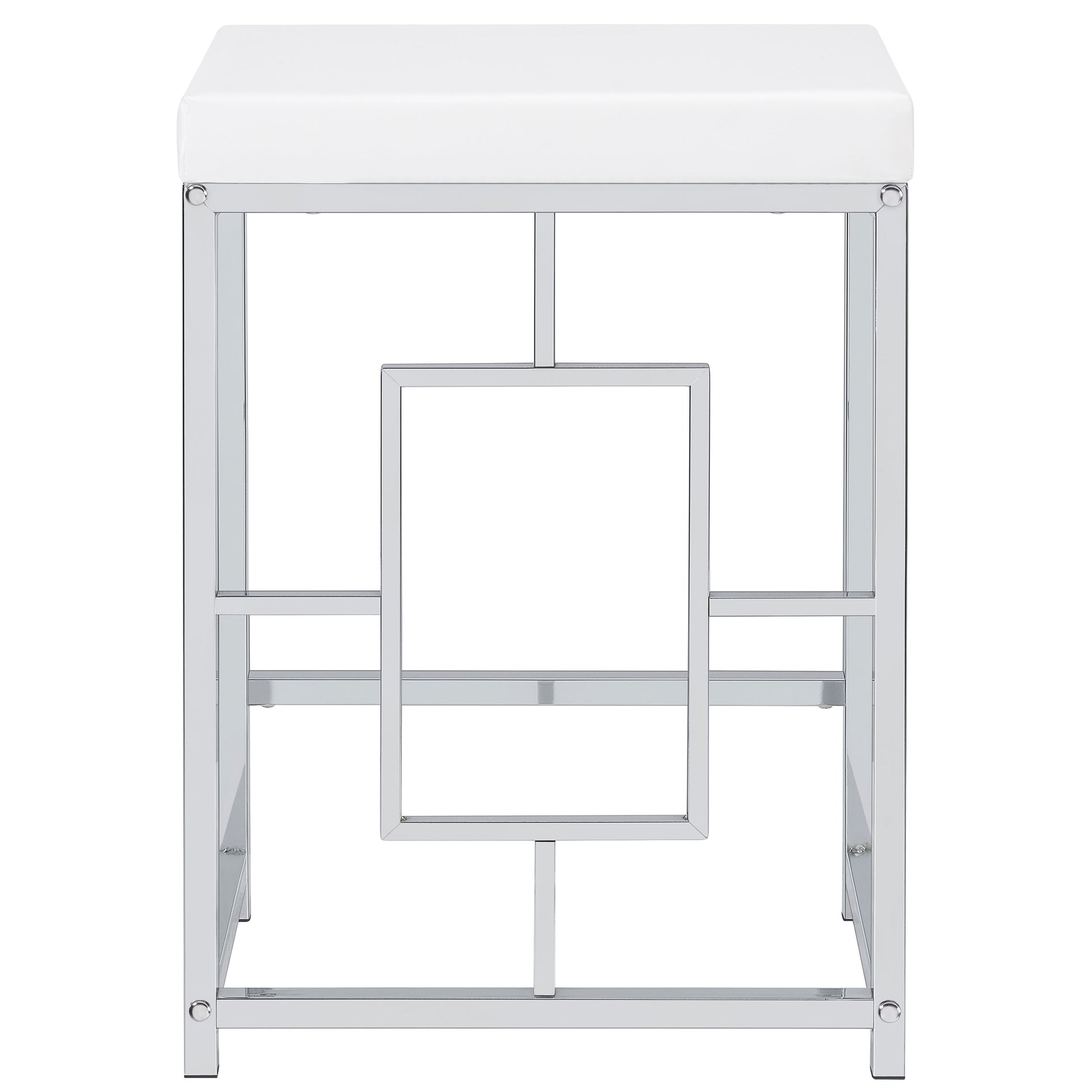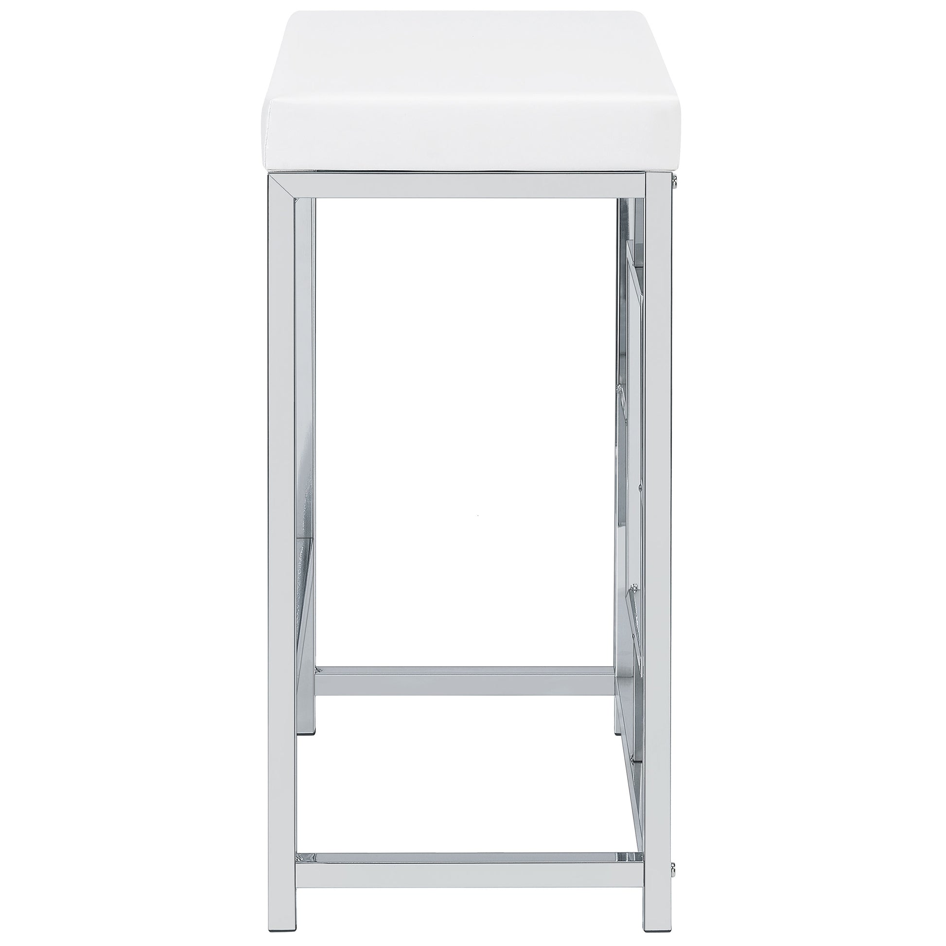 We love this modern five-piece counter height dining set in place of a console behind a floating sofa, offering exceptional versatility and refined style in any setting. It boasts two nesting tables, each long and narrow like a sofa table, but paired with three backless stools that tuck underneath. It's the perfect spot for drinks with friends on game day, or setting yourself up to work from home on a snowy day. The silver and white set features a larger table with wheels on the smaller table to create any configuration that works for you. Stools are decorated with artistic bases with open, floating frames that add Deco flair and white faux leather upholstery over padded seats for optimal comfort.