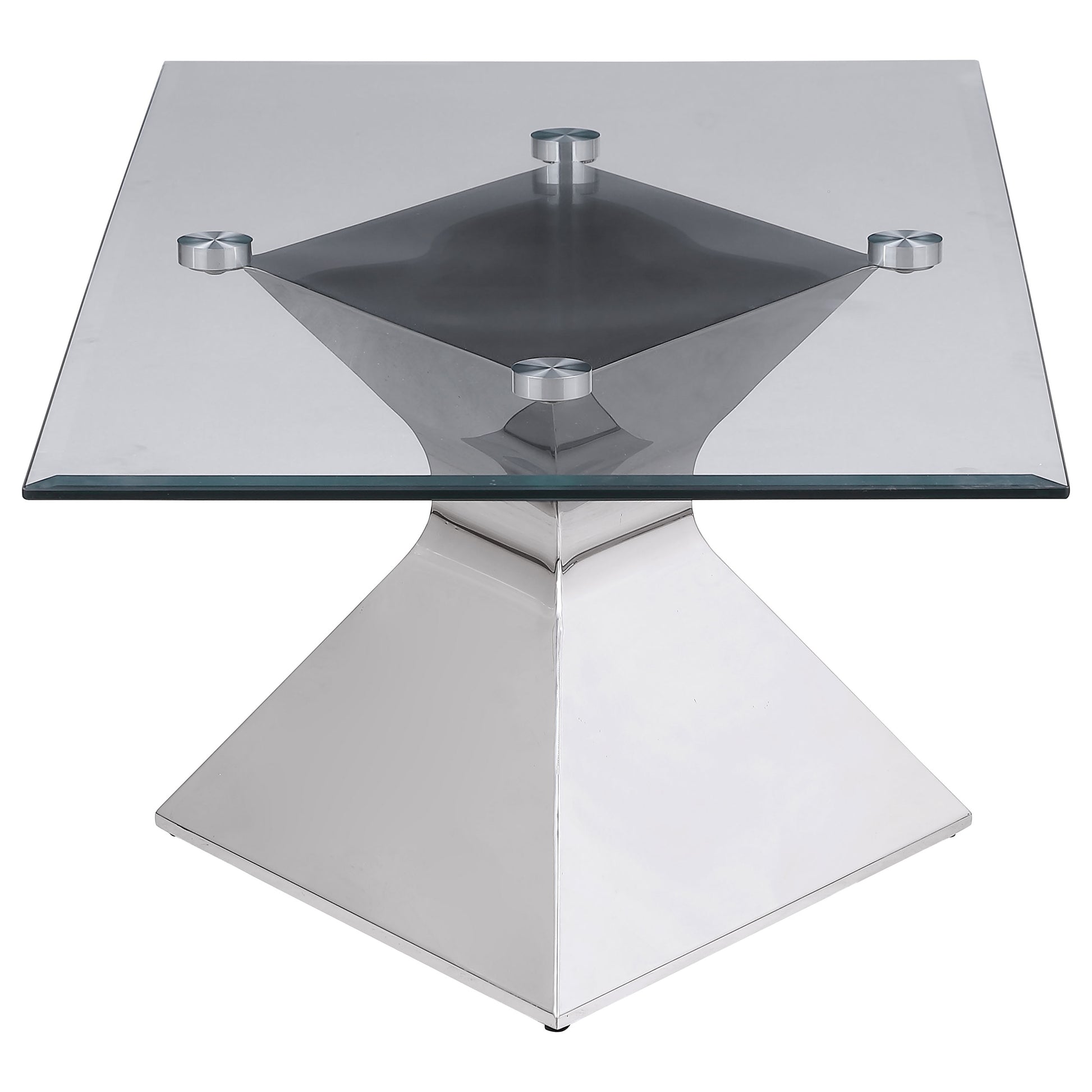 Elevate your living space with this contemporary coffee table set, featuring tempered glass tops and polished stainless steel hourglass-inspired bases. The coffee table boasts a rectangular top, while the end table offers a square top, both with beveled edges for added refinement. Clear glass surfaces highlight the sculptural curves and geometric design of the bases. Designed for modern interiors, this set combines sleek artistry with practical functionality.