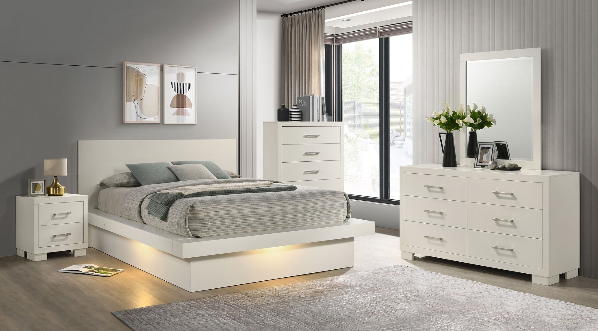 Modern elegance meets everyday comfort in this bedroom set. A sleek platform bed features integrated LED lighting beneath the side rails and foot, offering a soft ambient glow that enhances its floating silhouette. Coordinating case pieces with felt-lined top drawers and silver-tone bar pulls add refined functionality. Crafted from rubberwood and engineered wood, each element embodies quiet sophistication, bringing timeless harmony to contemporary spaces.