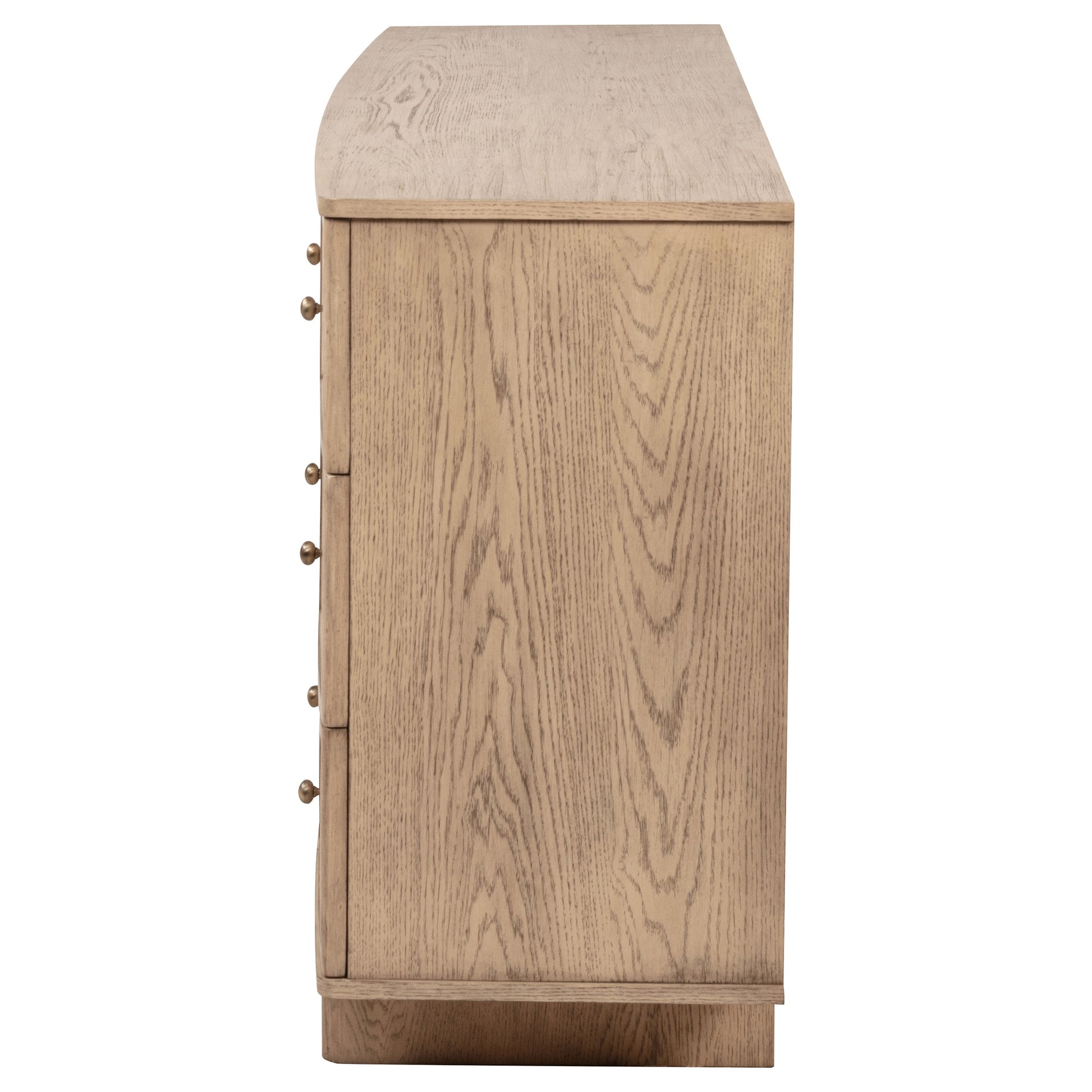 This nine-drawer dresser offers generous storage and timeless style, making it an essential piece for your bedroom. The beige oak finish exudes warmth and sophistication, while the smooth metal extension glides ensure easy access to your wardrobe. Antique brass hardware adds a vintage-inspired touch, blending beautifully with the overall design. Crafted from durable materials, this dresser combines functionality with elegance. Enjoy organizing your space in style with this versatile dresser.