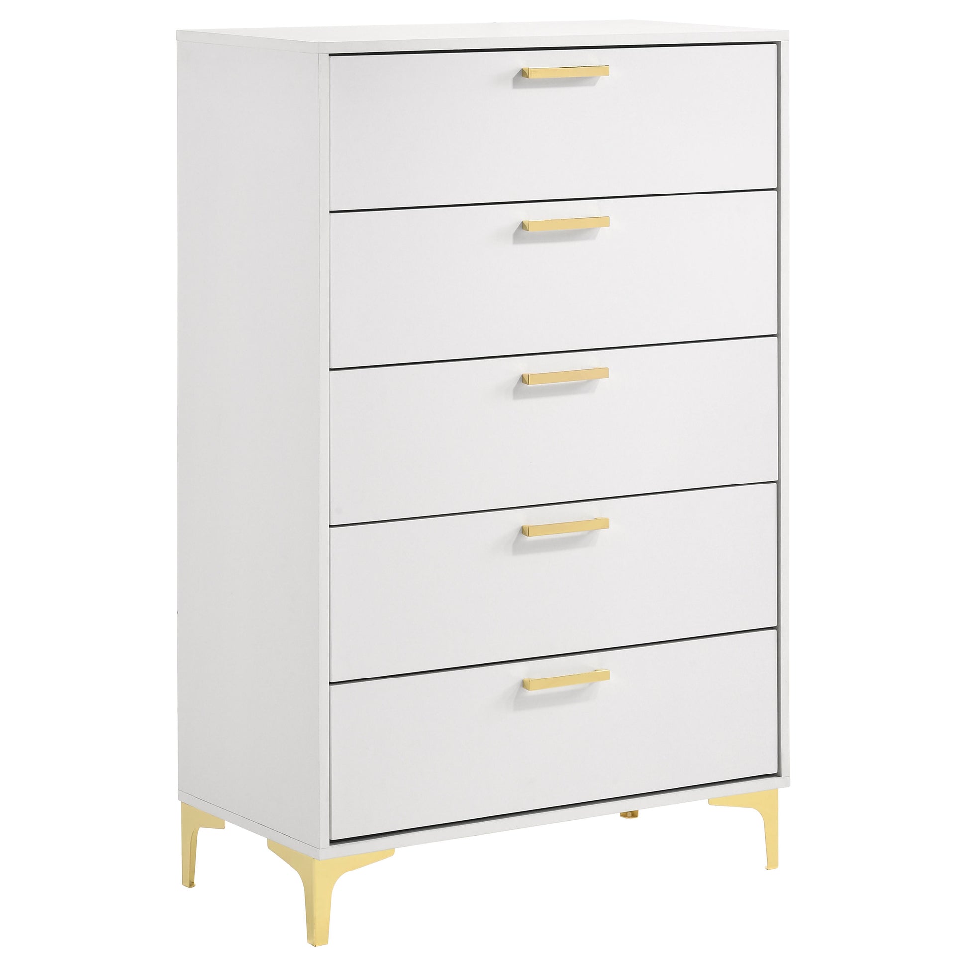 Instantly elevate the look of your bedroom oasis with this modern glam bedroom set. Chic, warm, gold elements lend a luxe accent to the upholstered platform bed and accompanying pieces. The bright, white finish sets the stage and offers a clean, contemporary aesthetic with a light and airy expression. The lovely headboard takes your breath away with its diamond tufted design and striking bar button details. Matching the warm, golden buttons are gold bracket legs, adding elevation to the bed and a retro-inspired look and feel.