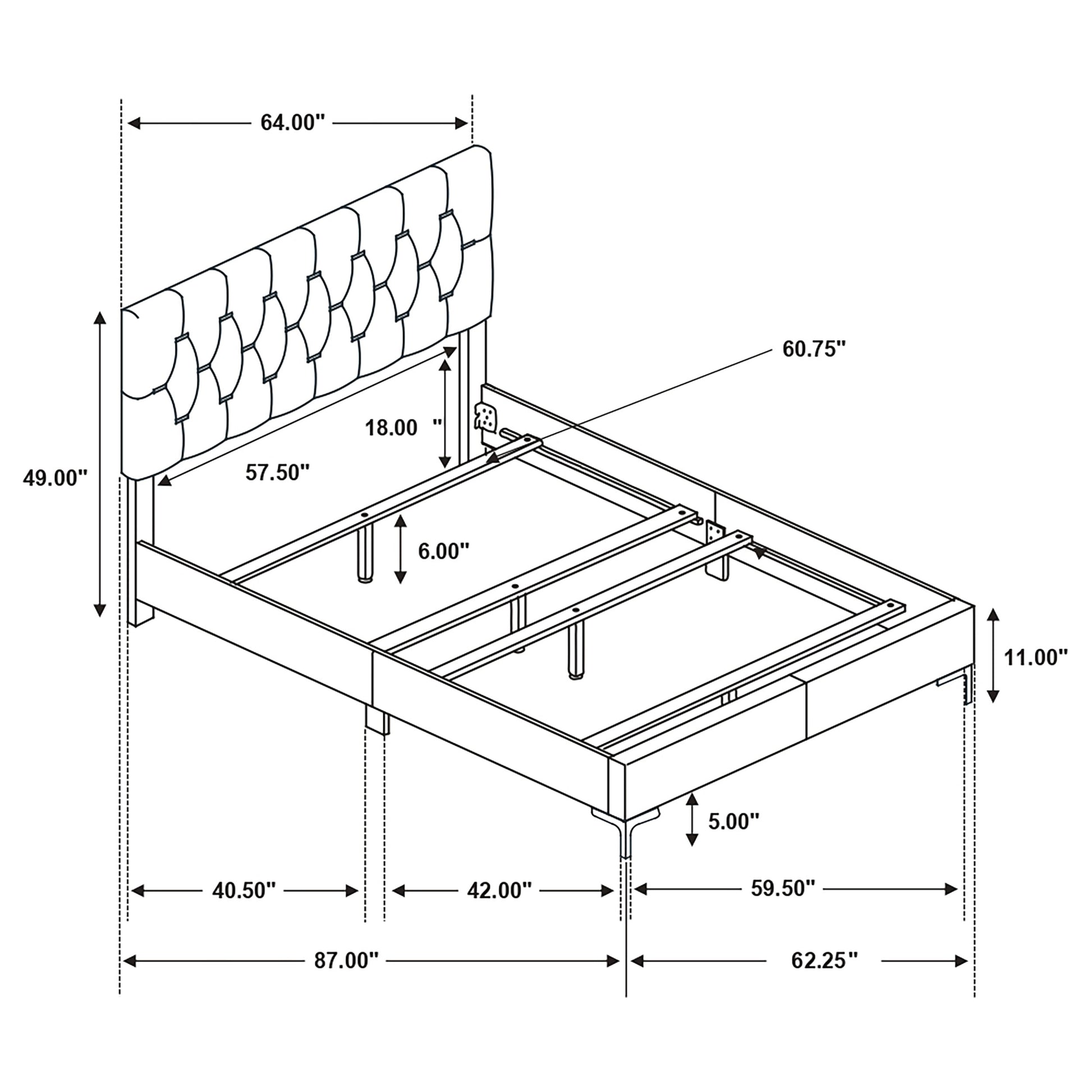 • Diamond tufted headboard accented with gold bar buttons lend a luxe look