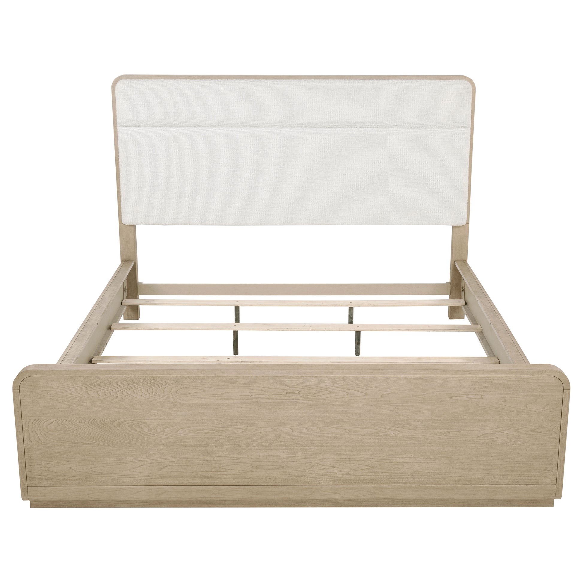 • Contemporary California king panel bed with a light elm finish for a modern, clean aesthetic