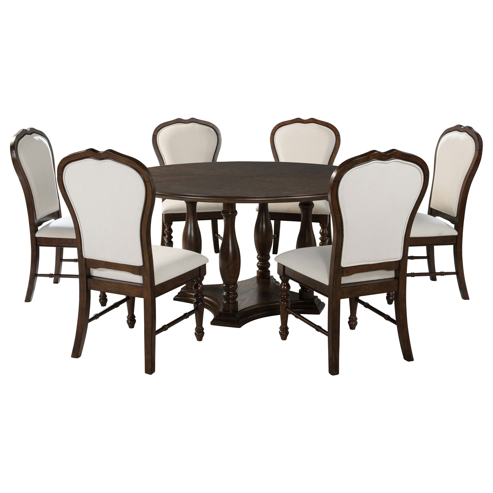The combination of ivory upholstery and a rich brown wood finish creates clean, precise style for this traditional round dining set. Its crafted in quality rubberwood and engineered wood, delivering strength and durability paired with turned details. The table features a spacious r with a decorative edge and charming base design. Chairs add rounded, framed backs and plush foam cushions, perfect for leisurely meals with family and friends. The set lends handsome, refined character in your dining room or kitchen.