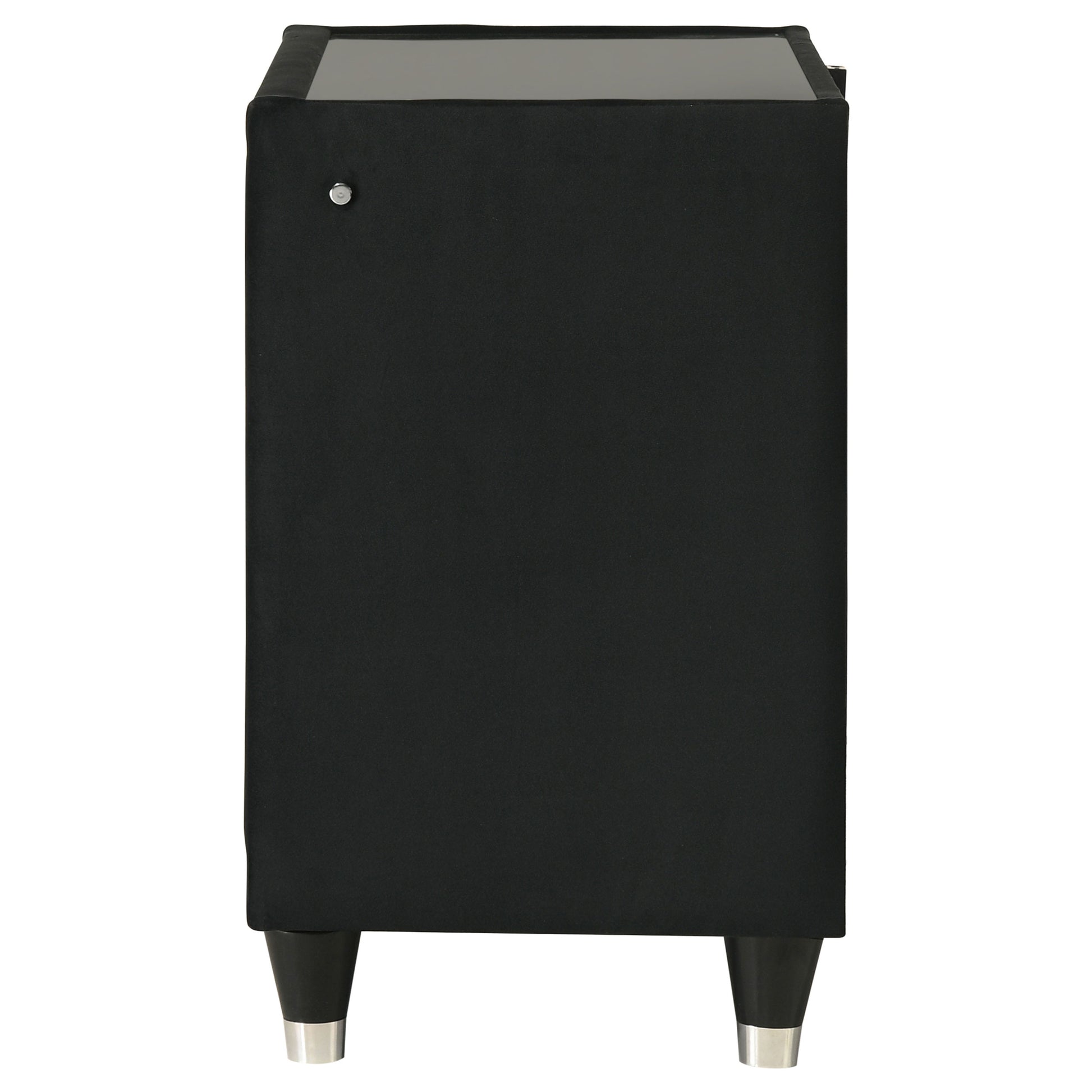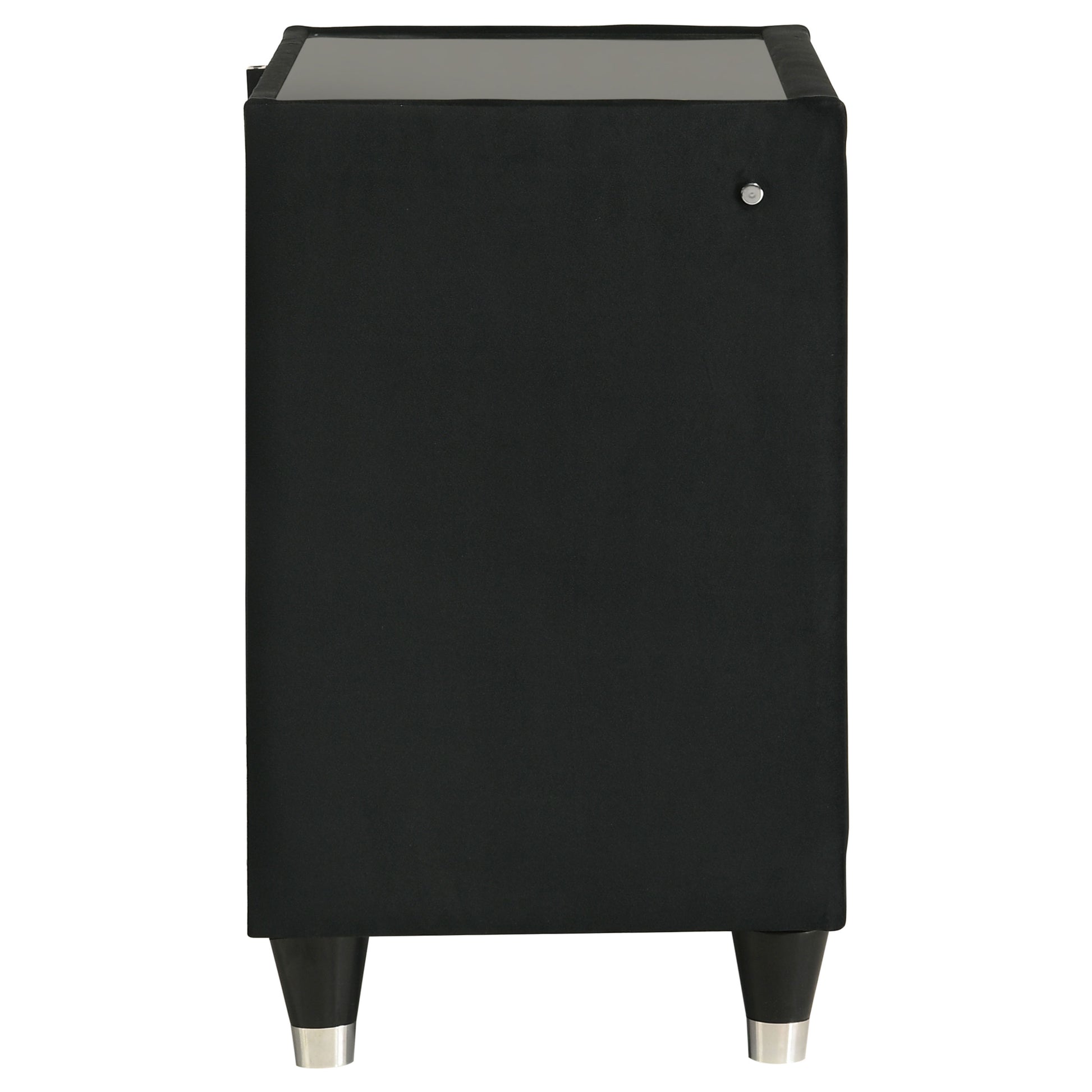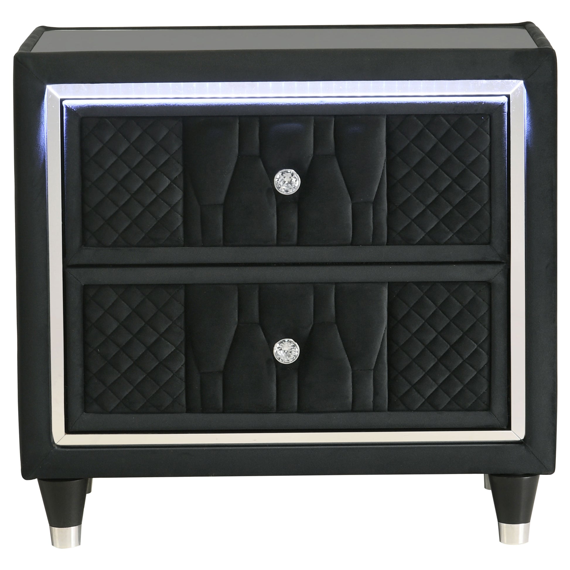Bring luxe utility bedside with this two-drawer nightstand, where velvet elegance meets modern convenience. Wrapped in a black velvet, it features quilted textures, crystal knobs, and reflective acrylic accents beneath a clear tempered glass top. LED case lighting softly illuminates the silhouette, while a built-in USB charging port with USB-A and USB-C keeps devices close at hand. Designed with dovetail joinery, felt-lined drawers, and solid rubberwood leg, it blends softness, sparkle, and smart function.