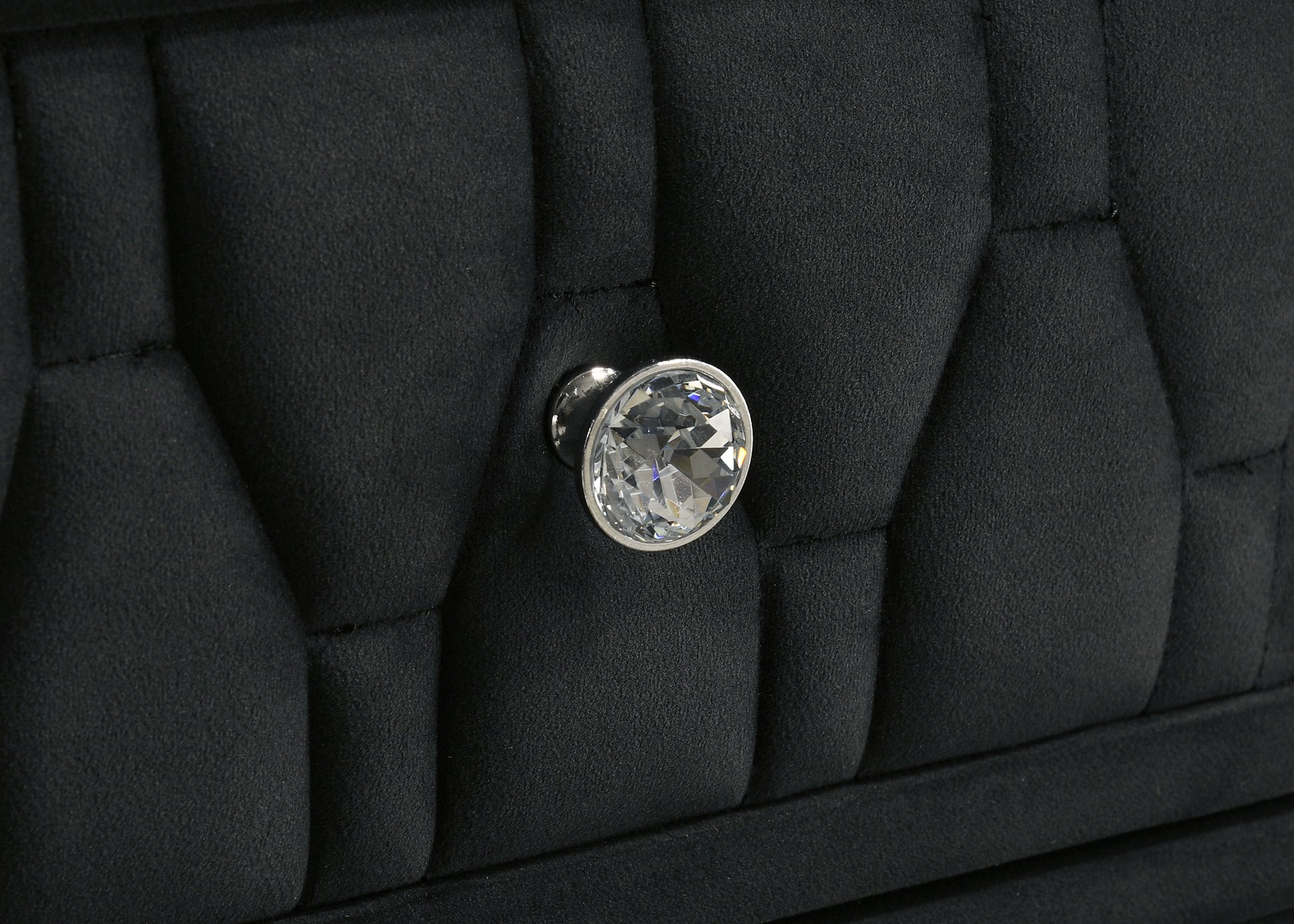 • Top drawer is black felt-lined and finished with crystal knobs and quilted texture