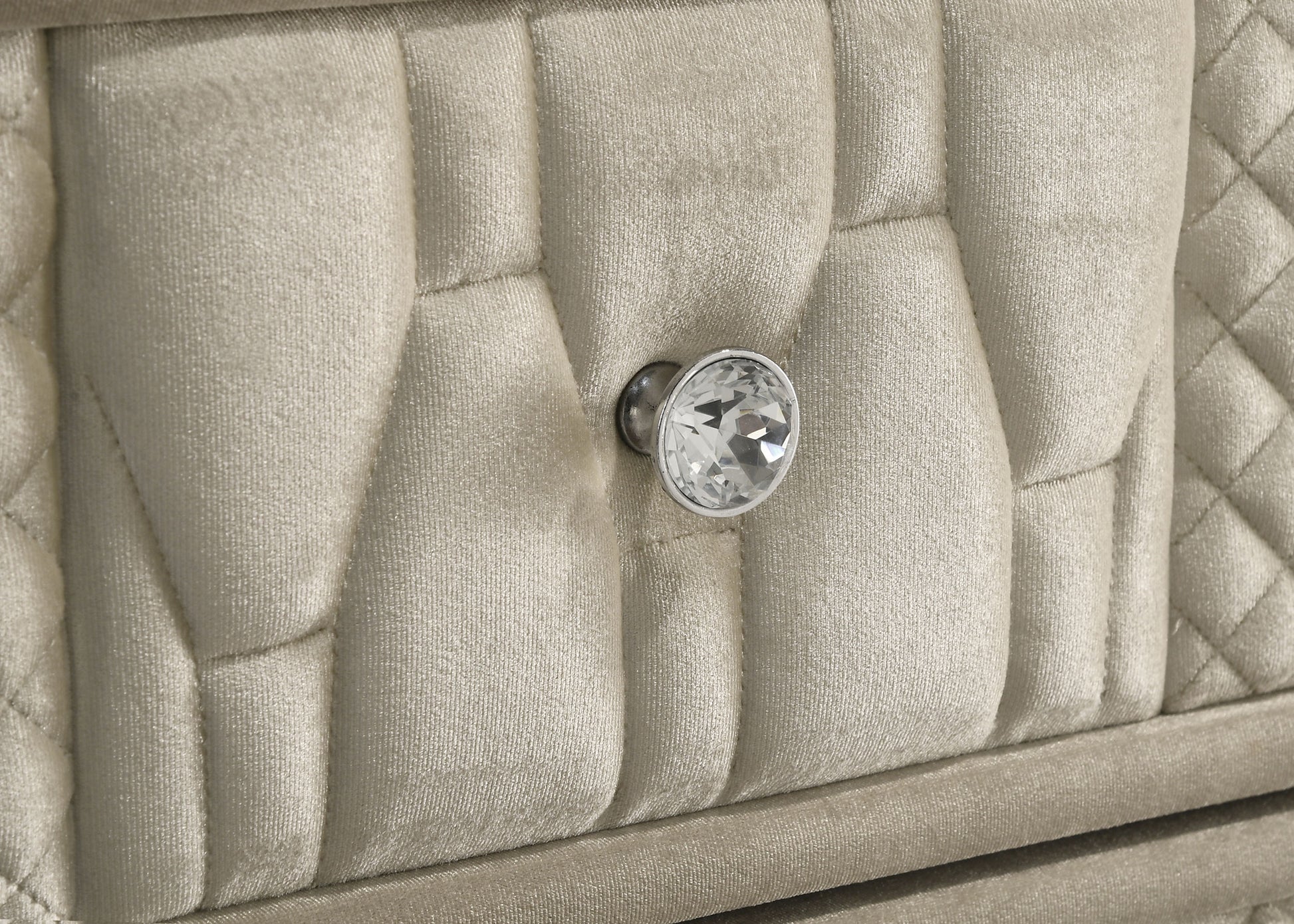 Wrapped in sumptuous ivory and camel velvet, this eight-drawer dresser exudes soft luxury with functional brilliance. Reflective acrylic accents, crystal knobs, and quilted fronts enrich each drawer, while LED trim and a clear tempered glass top add a luminous, polished finish. Solid rubberwood legs elevate the profile, and brown felt-lined top drawers, dovetail joinery, and heavy-duty glides ensure enduring performance and elegance.