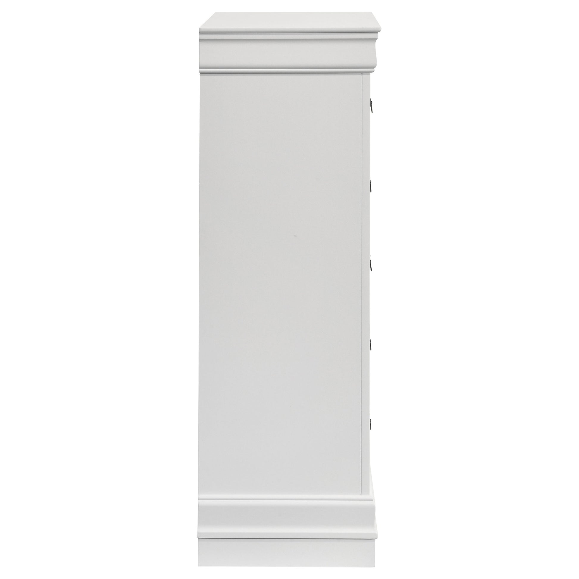 Complete your stylish bedroom with the ample storage provided by this transitional five-drawer chest. It's cool white finish blends in a variety of bedroom spaces, creating a fresh, approachable look. Each drawer features a hanging pull in a dark finish, creating a touch of character and contrast. Molded trim and bracket feet complete the look with a hint of movement. Use the top for a valet or jewelry box or choose decor that adds a personal touch.