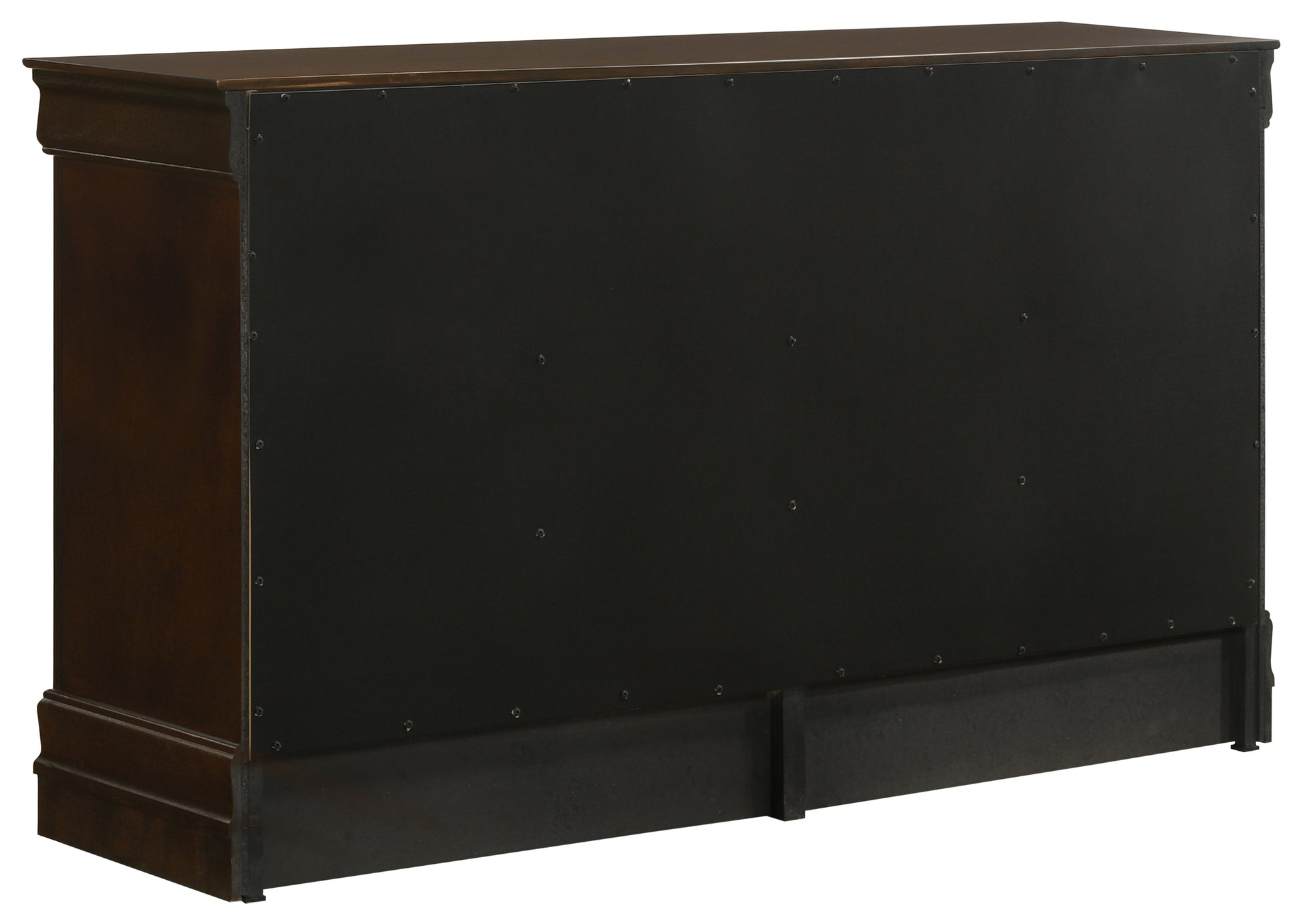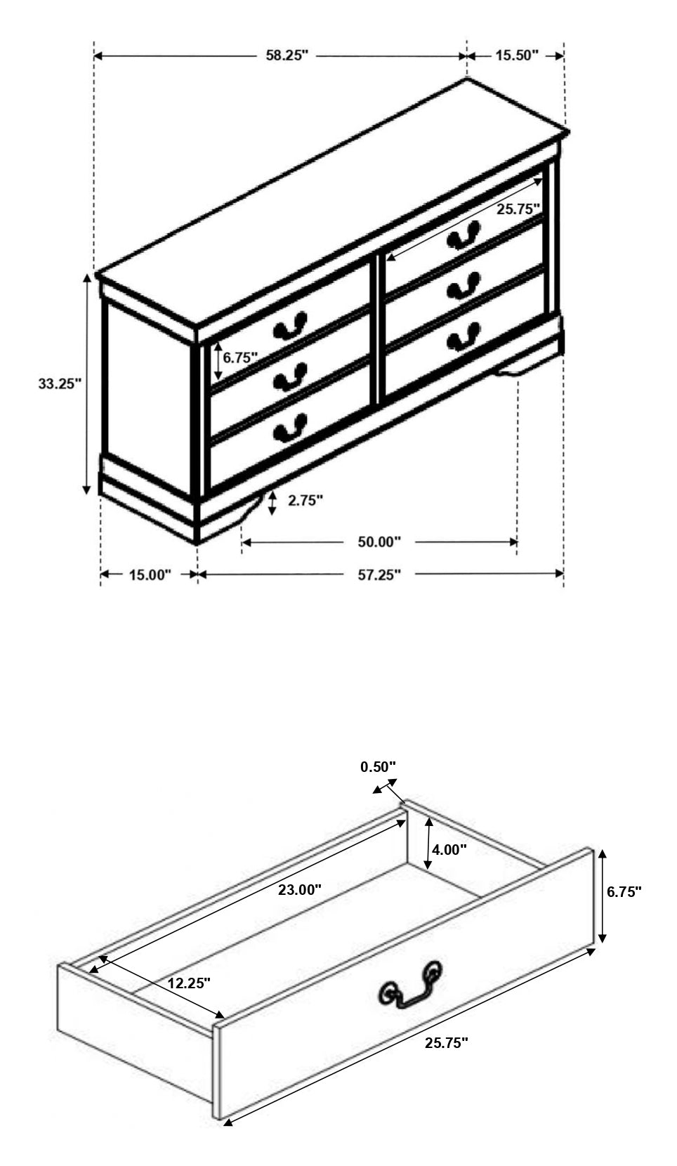 The Louis Philippe collection features this 5-piece bedroom set that is well-suited for a youth or guest bedroom. The Full bed (also available in Eastern King, Queen, and Twin) has a slightly flared headboard and footboard for added styling. The nightstand and chest have spacious drawers featuring dovetail construction and handy yet stylish silver bail handles. The dresser features drawers with similar construction and accents as well as enough space on top for the rectangular mirror with clean lines to complete the look. This traditional style set is crafted from select hardwoods and wood veneer and with a warm cappuccino finish for an elegant appeal.