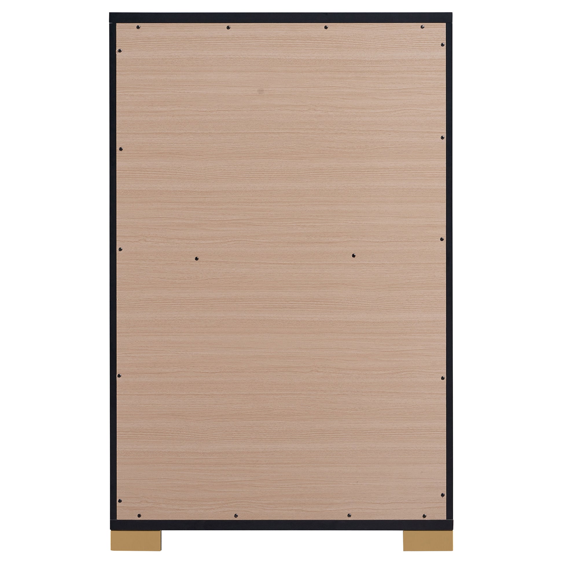 Minimalism never looked so elegant as it does in this elegant five-drawer chest, an excellent option for your updated bedroom ensemble. Modern design details produce a chic vertical chest with an Art Deco vibe and tons of storage space. Made of wood products, this five-drawer chest features a versatile finish with accenting from gold finish metal, placed carefully to emphasize a geometric linear effect. Store incidentals and accessories in drawers operating smoothly on center metal glides. English dovetail drawer construction embellishes this chest’s quality, as vertical gold metal drawer hardware offers a unique impact.