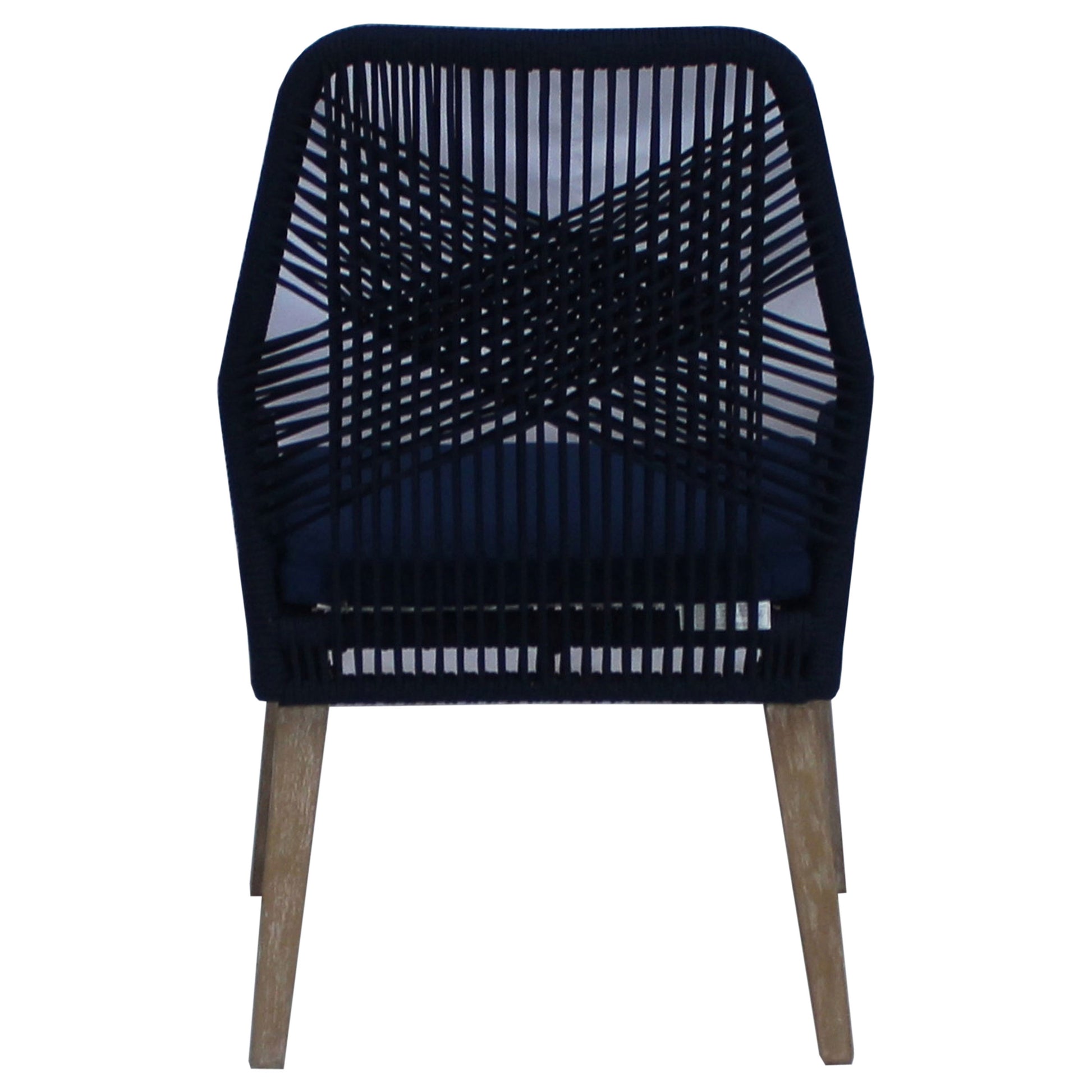 Create a nautical-inspired space with this pair of contemporary dining chairs. With a frame constructed of a sturdy solid mahogany wood, and tapered flared legs in a weathered finish, these transitional style dining chairs are perfectly suited for anything from coastal cottages to lakeside retreats. Featuring a seat frame that is wrapped in a woven poly rope fibers all around, this chair offers a breathable backrest and open and airy design. Slide these chairs up to a dining table or place them in a corner to soften and accent the space. To add to the seating comfort is a foam-filled cushion, wrapped in a dark blue fabric that matches the dark navy rope silhouette.