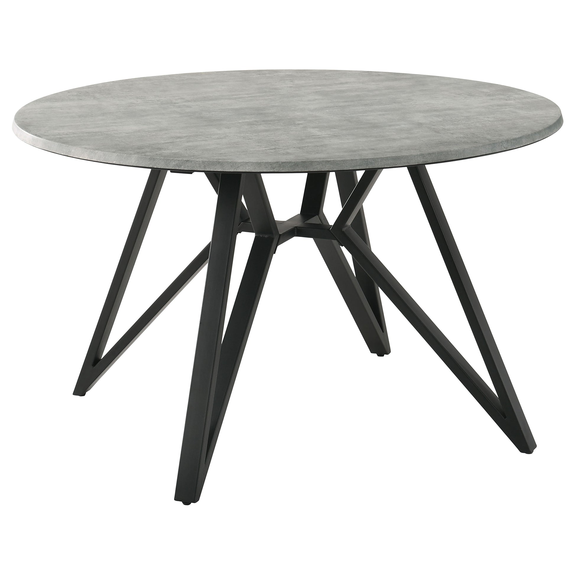 Elevate your modern industrial dining area with this retro-inspired round dining table. Designed with a high pressure laminate table top with a concrete-looking decoration paper, this dining table offers a raw, organic texture to the space. The spacious, round table top rests on a butterfly style iron base, lending a sleek and masculine feel. With a bold, gunmetal finish, it grounds the room and brings a dramatic dark tone. Place this wonderfully designed dining table in a dining room as an eye-catching statement piece.