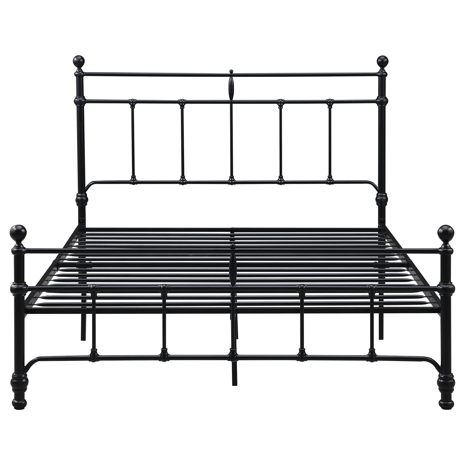 Bring timeless charm and elegance to your bedroom with this beautifully crafted metal bed. Its vintage-inspired design features a sturdy metal frame, complete with intricate detailing on the headboard and footboard, all finished in a sleek matte black powder coating. This finish not only enhances its classic silhouette but also provides a durable, long-lasting surface. Perfect for traditional, rustic, or industrial-themed interiors, this bed combines style with robust construction for lasting support and a comfortable night's sleep. Elevate your space with the subtle sophistication of this statement-making metal bed.