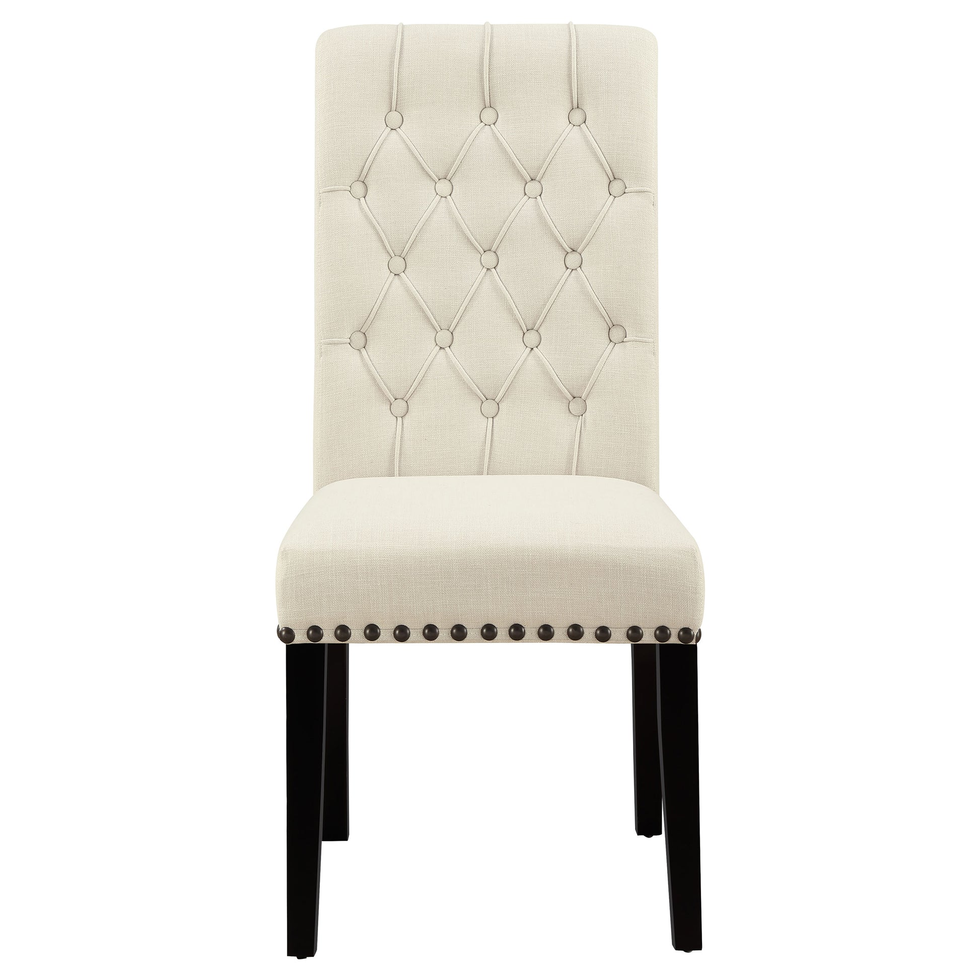 • Rustic espresso wood finish is contrasted by cream color tufted parson side and arm chairs with nailhead trim
