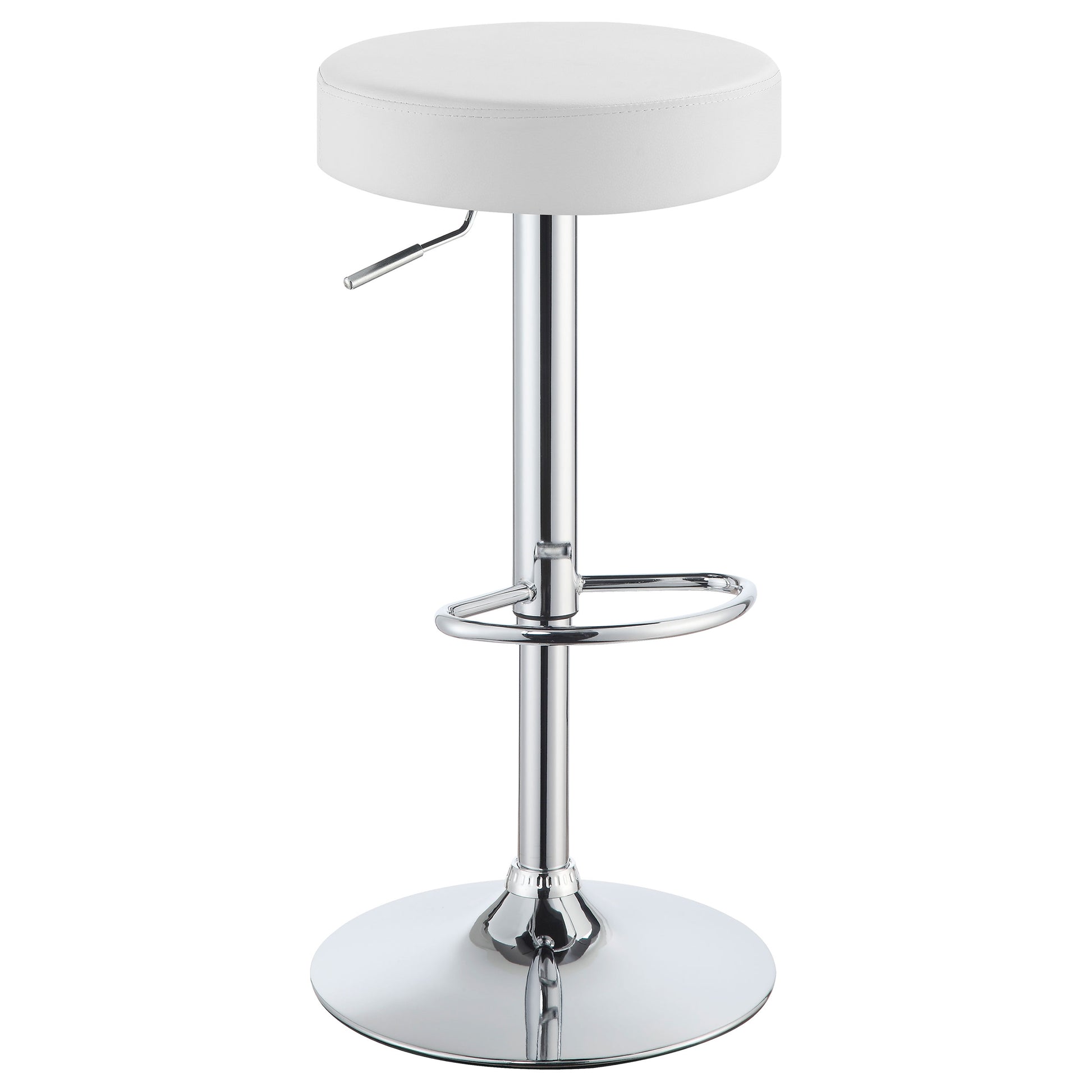 Add a sleek and modern touch to your space with this minimalist adjustable bar stool. Featuring a round, cushioned seat in durable faux leather, it provides comfort and style for any counter or bar area. The hydraulic gas lift mechanism allows for easy height adjustment, ensuring a perfect fit wherever you need it. With a sturdy chrome base and built-in footrest, this stool combines practicality with contemporary flair. Ideal for both home bars and kitchens, it offers a compact and versatile seating solution.