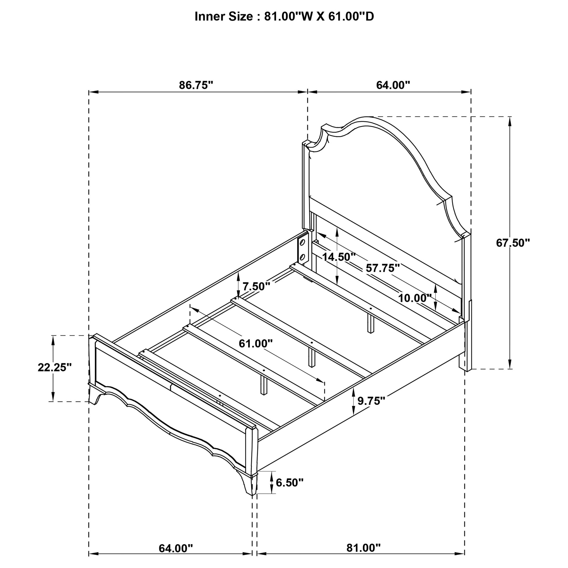 This French Provincial-inspired bed blends timeless elegance with modern craftsmanship. The arched headboard features an ecru fabric upholstered panel, framed by a gracefully curved solid poplar and engineered wood structure. A washed mango veneer finish enhances the natural grain, complementing the scalloped detailing on the footboard. Built with sturdy materials, this bed offers durability and refined style for a sophisticated bedroom setting.