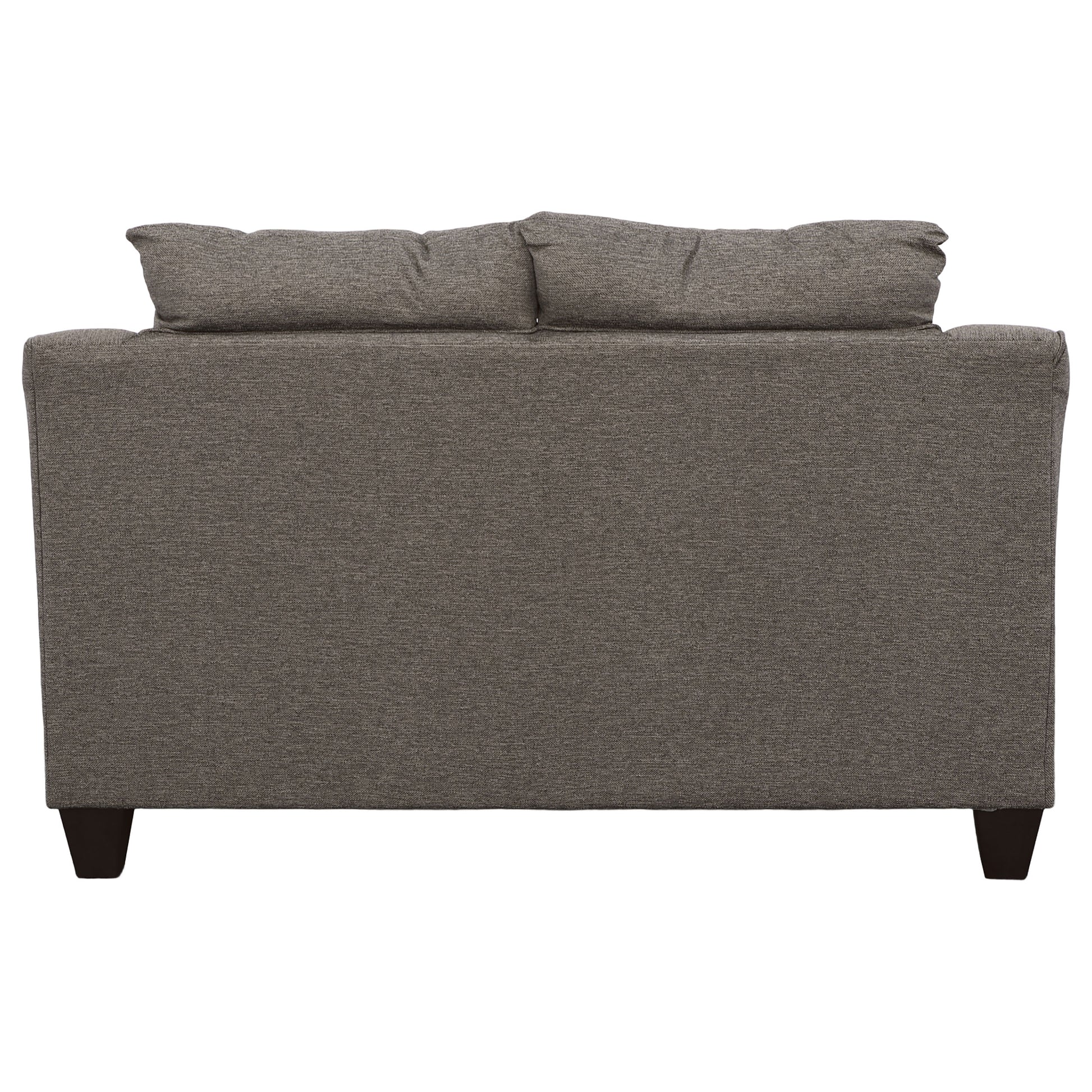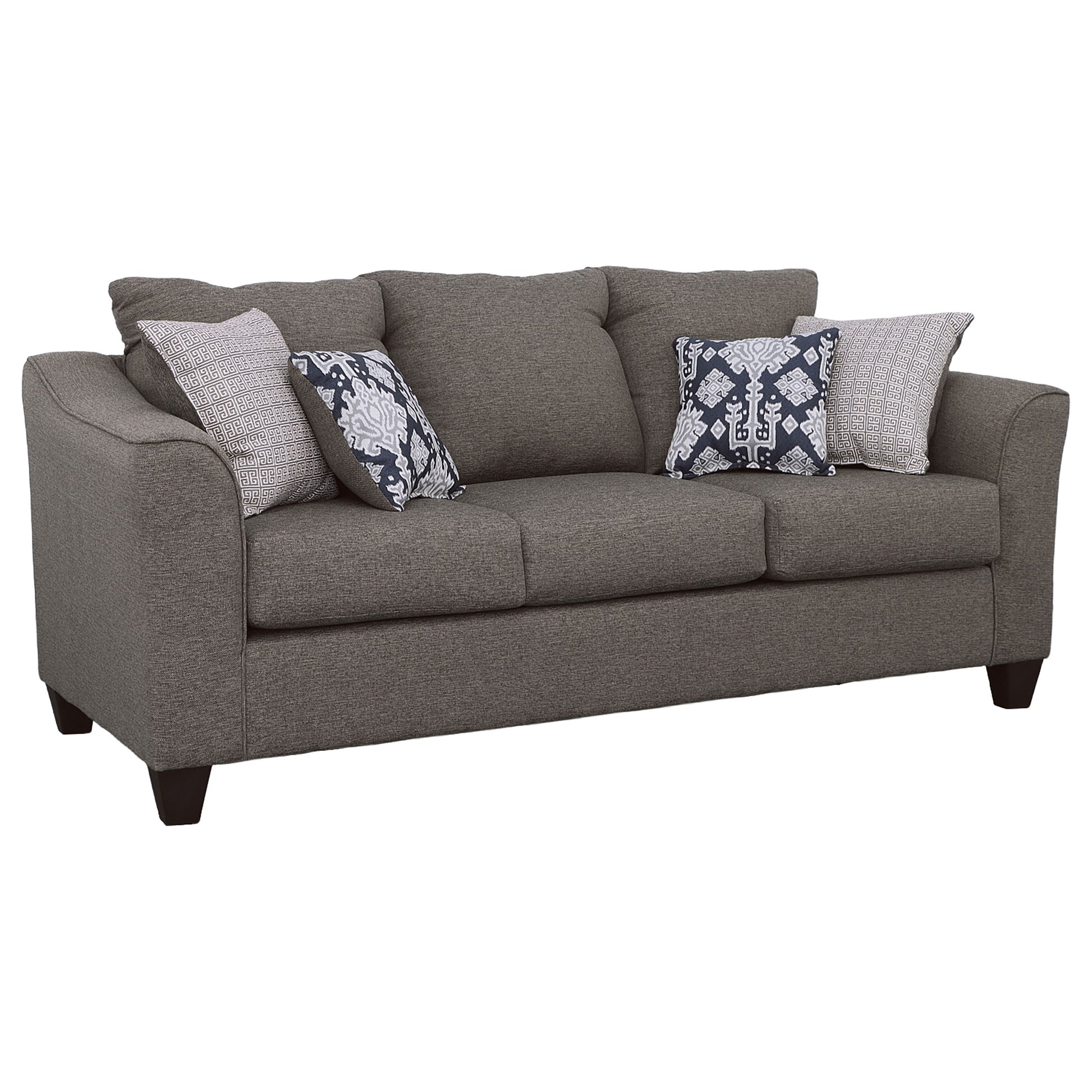 Simple and timeless, this three-piece living room set offers comfort. Full of structure, the timeless silhouette is complete with high density full foam seat cushions. Including a sofa, loveseat, and chair, this set is scaled for smaller settings. Revel in the comfort of flared arms and included contrasting accent pillows. Grey upholstery marries block tapered legs in a deep hue to warm up any space.