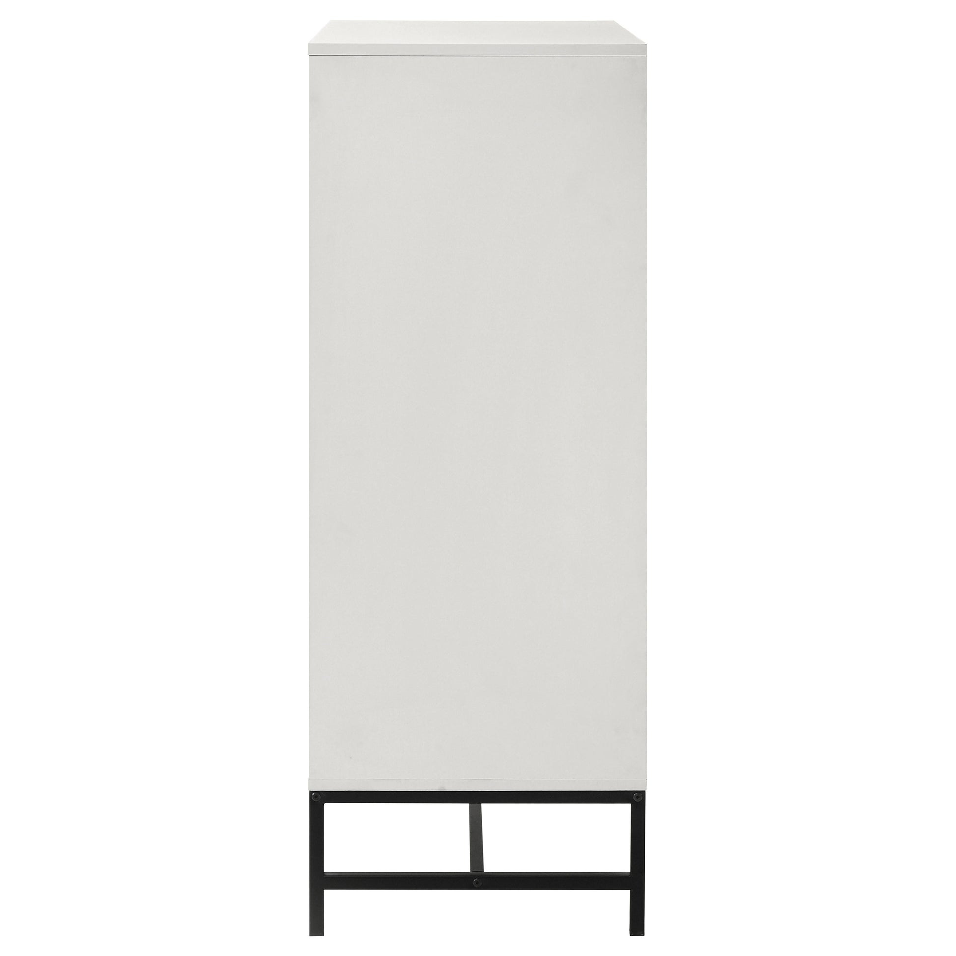Create ample storage with the compact footprint of a modern four-drawer chest. Its roomy drawers are ideal for clothing, linens, and accessories, helping to keep your personal space tidy and organized. A white finish complements straight, clean lines, while black hardware adds contrast and depth. complementary metal base in black adds light, airy ambiance. Use the top for decor like photos, or add a jewelry box for a personal touch.