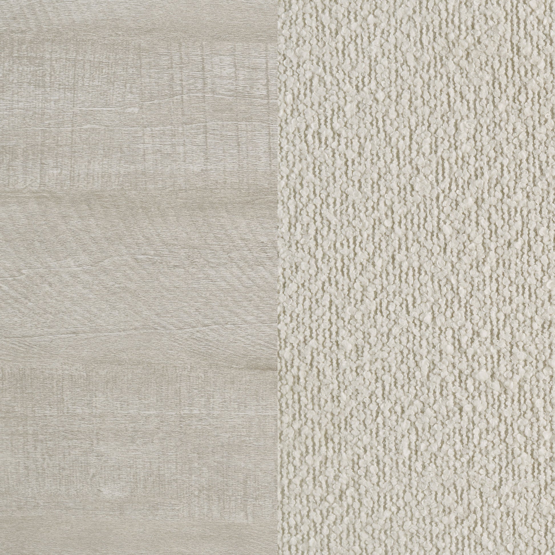 This contemporary bed is the perfect fusion of style and comfort, designed to bring a cool, modern vibe to any bedroom. With its unique "floating" effect, it creates a sense of spaciousness and sophistication. The headboard is upholstered in a soft, cream bouclé fabric, adding a touch of texture and warmth that complements the bed's rustic cream finish. Crafted from rubberwood and engineered wood with a rough-sawn, white-washed engineered paper veneer, this bed showcases a Yin & Yang contrast between rustic and refined design elements.