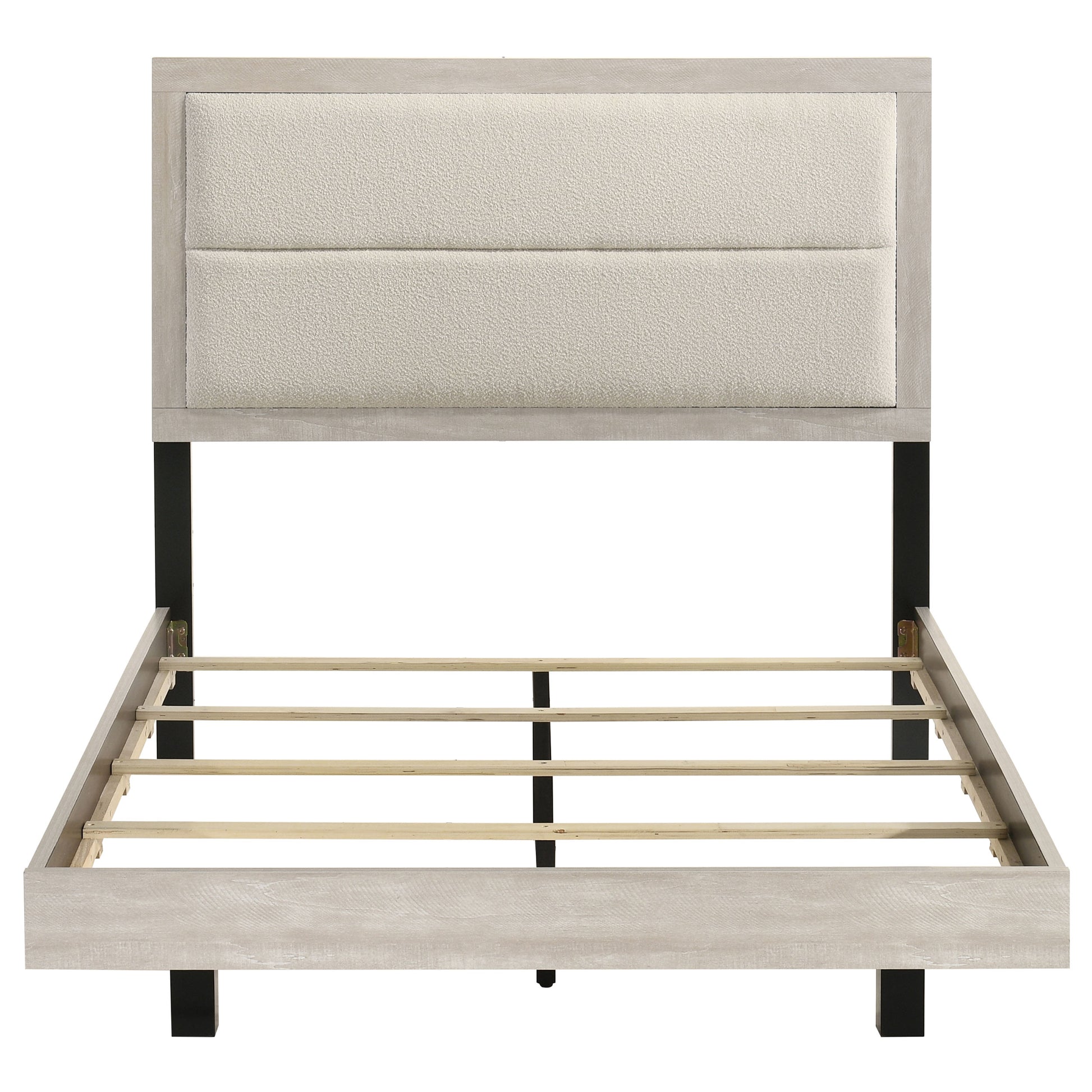• Headboard upholstered in cream bouclé fabric for added softness and style